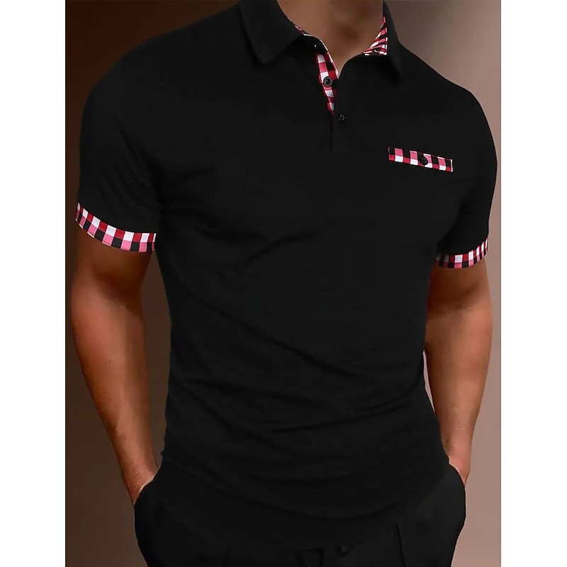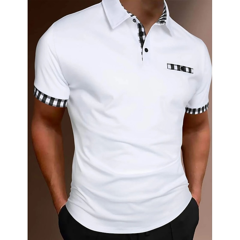Highlights [Fabric and Comfort]: Crafted from a high-quality polyester blend, this men's polo shirt offers soft, breathable comfort, ideal for summer wear. Its micro-elastic material ensures ease of movement, making it perfect for both casual and semi-formal occasions. [Fit and Silhouette]: Featuring a regular fit, this polo shirt flatters the body shape without being too tight, offering a comfortable yet stylish look. The button-up neckline provides an adjustable fit that enhances its polished and refined appearance. [Design Highlights]: Elevating the classic polo style, this shirt is adorned with distinctive color block patterns that add a modern touch. The checkered accents on the collar and sleeve cuffs introduce sophistication and contrast, while the single button pocket detail on the chest adds both style and functionality. [Occasions]: Ideal for holiday outings and casual settings, this versatile shirt pairs effortlessly with jeans or chinos for a complete modern look. Whether for a relaxed weekend or an informal gathering, this polo shirt promises to elevate your style. [Size Range]: Available in a comprehensive range of sizes from S to 3XL, this shirt caters to a variety of body types, ensuring the perfect fit for everyone.