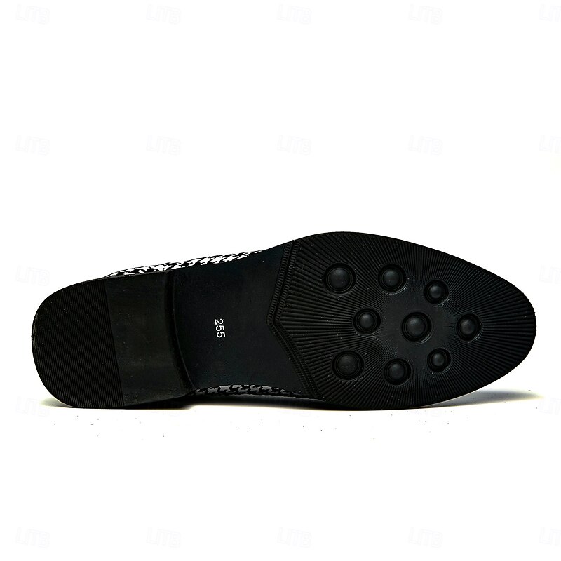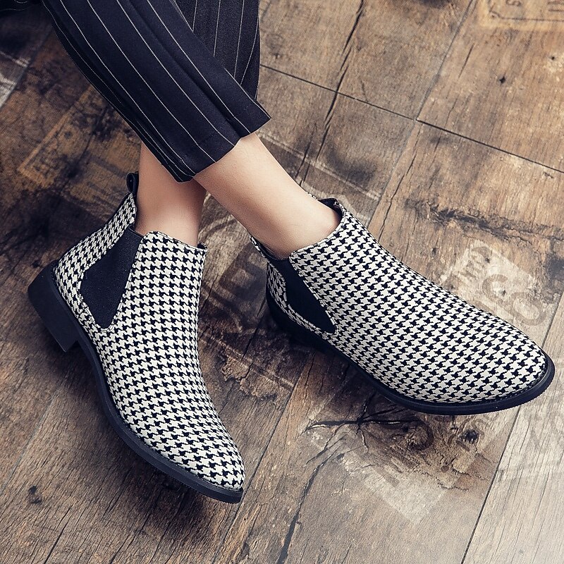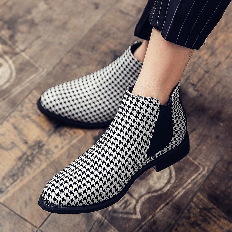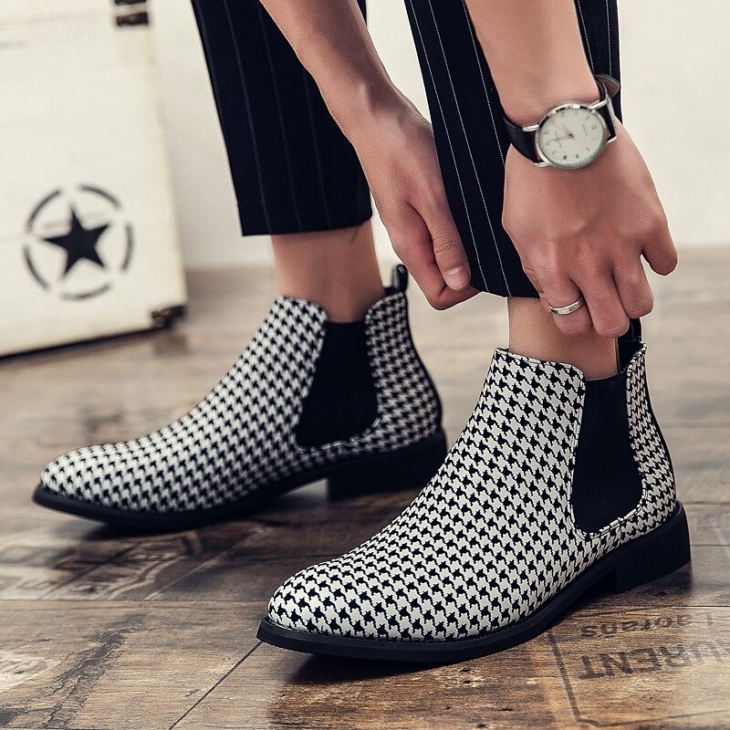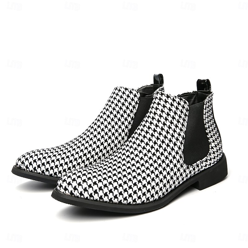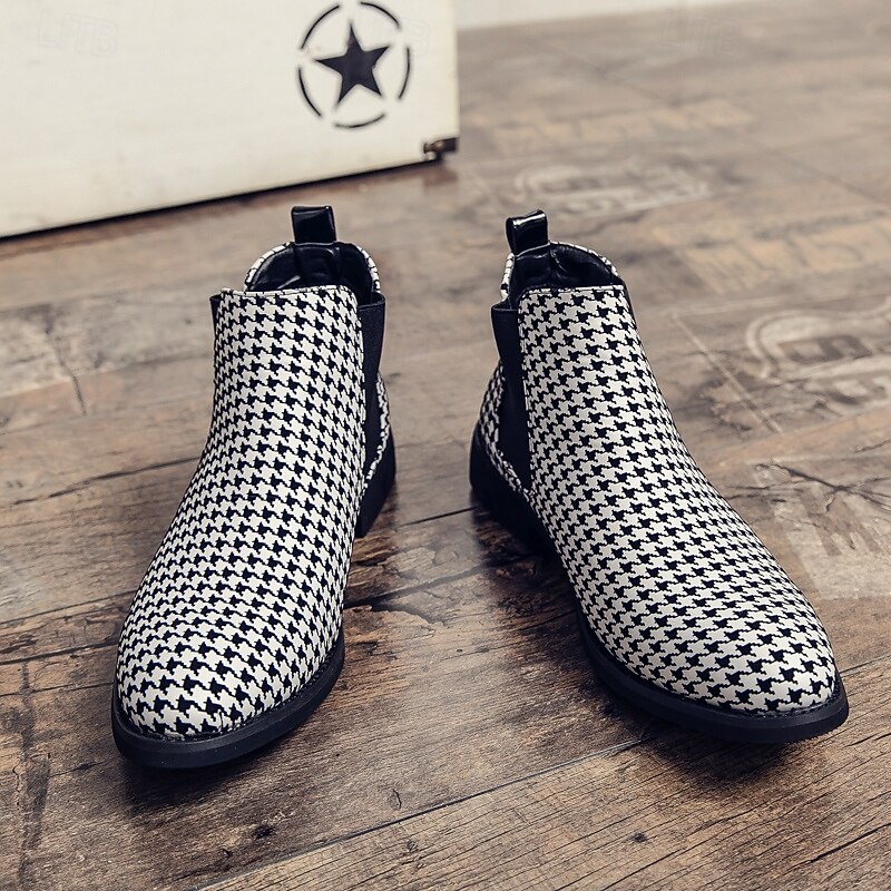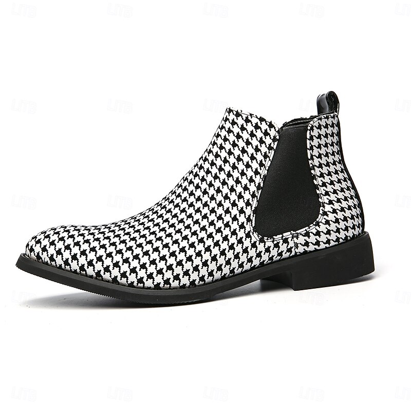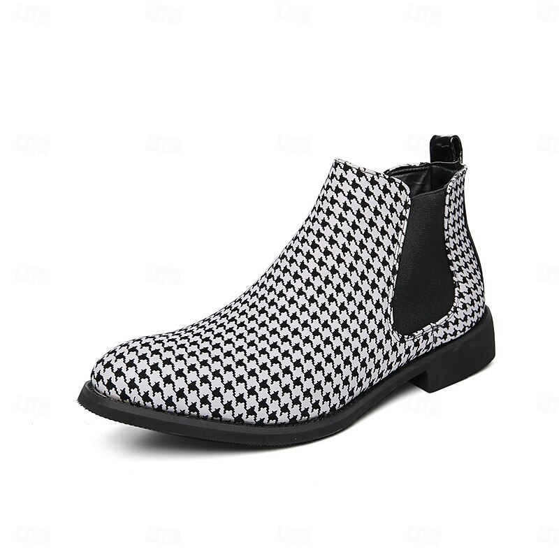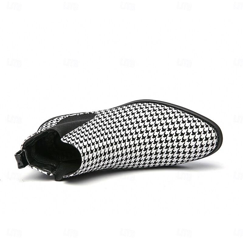 Highlights [Fabric and Material] These men's Chelsea boots are crafted with a high-quality fabric upper, featuring a classic houndstooth pattern in black and white. The lining is made from durable PU, ensuring comfort and wearability over time. [Style and Fit] Designed with a contemporary round toe and elastic side panels, these slip-on ankle boots offer a comfortable and secure fit. The sleek black sole is made from rubber, providing excellent traction and enhancing their fashionable appeal. [Design Highlights] The classic slip-on design is elevated by the geometric houndstooth pattern, making these boots a statement piece. The elastic side panels not only ensure easy wearability but also add a touch of elegance to the overall silhouette. [Occasions] Versatile in nature, these Chelsea boots are perfect for both formal and casual occasions. Whether paired with a sharp suit for a business meeting or worn with jeans for a weekend outing, they effortlessly blend style and sophistication. [Size Range] Available in a wide size range, accommodating US sizes 7 to 12. This ensures a comfortable fit for most individuals, making these boots an essential addition to any fashion-conscious wardrobe.