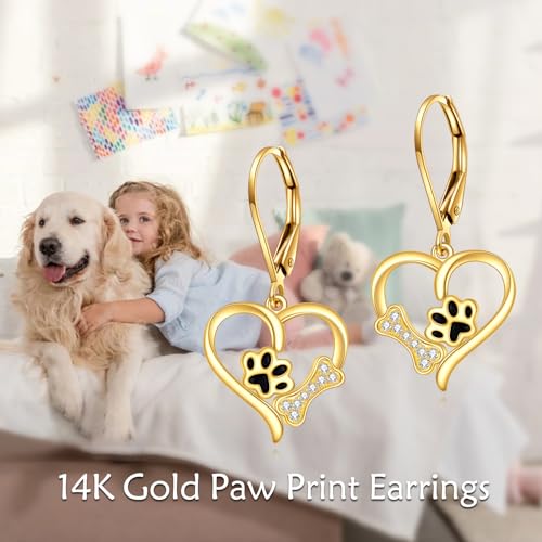 14k Real Gold Paw Print Earrings Hypoallergenic Heart Dangle Leverback Earring Dog Cat Lovers Jewelry Birthday Gifts for Women Teen Girls 1