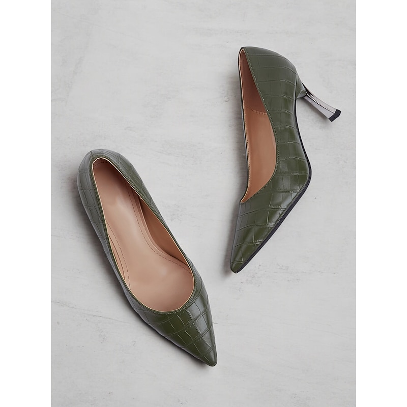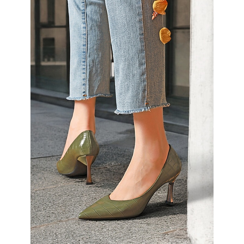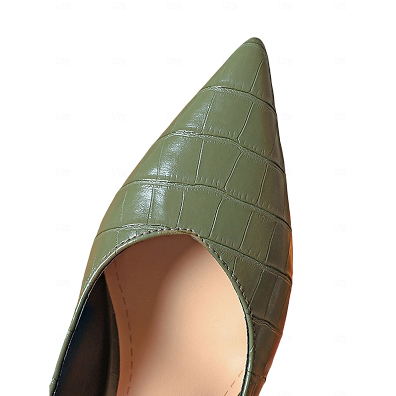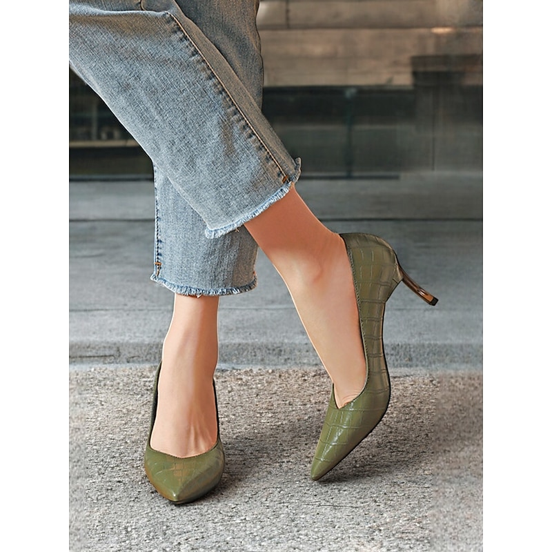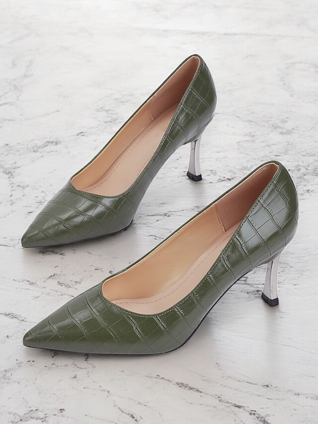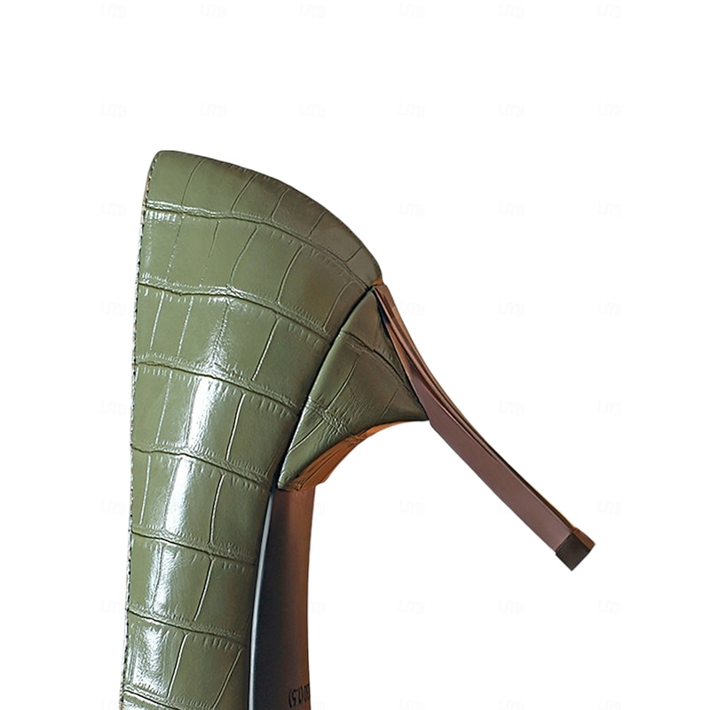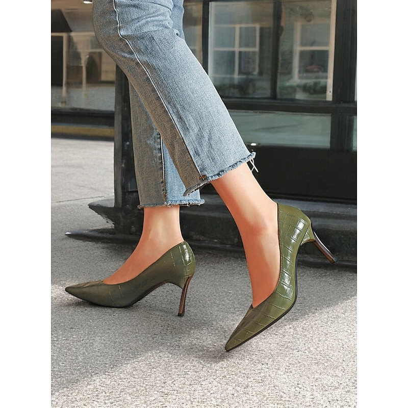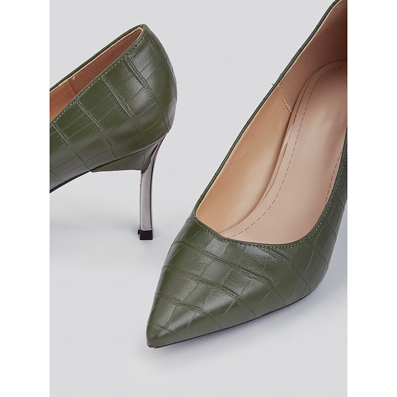 Highlights [Fabric] These elegant pumps are crafted from crocodile-embossed faux leather, providing a luxurious texture and sophisticated appearance. [Design Highlights] The shoes feature a pointed toe and are equipped with a metallic stiletto heel that enhances their stylish allure. The interior is lined with a cushioned material for comfort, making them suitable for extended wear. [Occasions] Perfect for work, office settings, and daily wear, these versatile pumps can easily transition from professional environments to evenings out, complementing dresses and tailored pants alike. [Design Details] The crocodile-embossed pattern adds an exotic charm, while the green color gives a unique and fashionable statement, producing an ideal blend of elegance and modern style. [Size Range] Available in sizes from US5.5 to US10.5, ensuring a perfect fit for a variety of customers.
