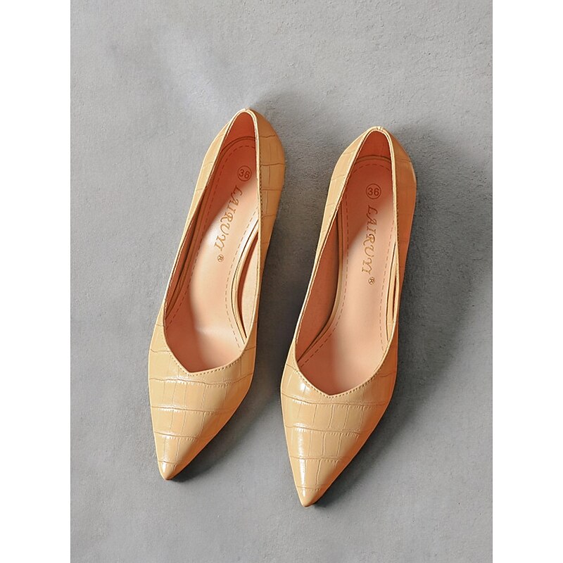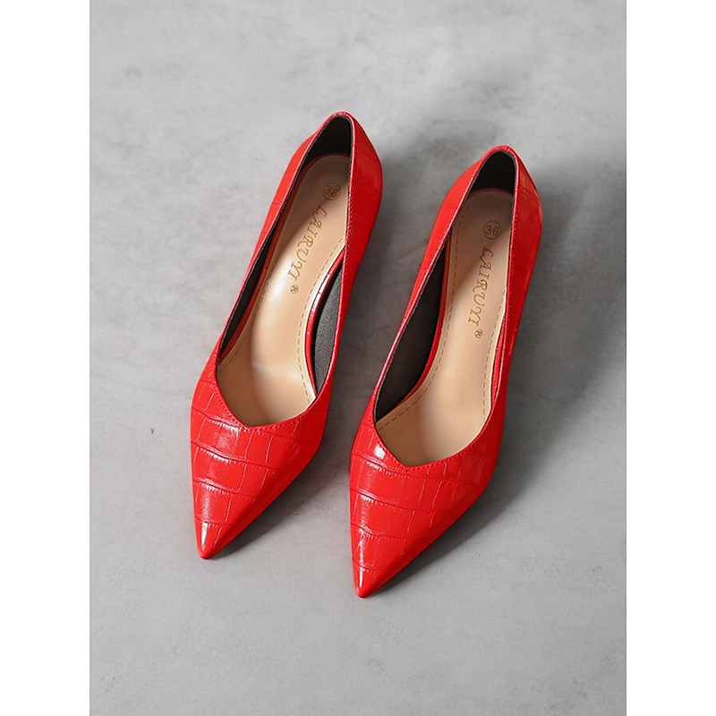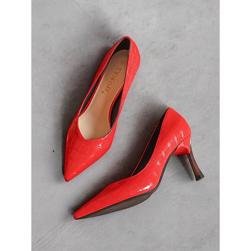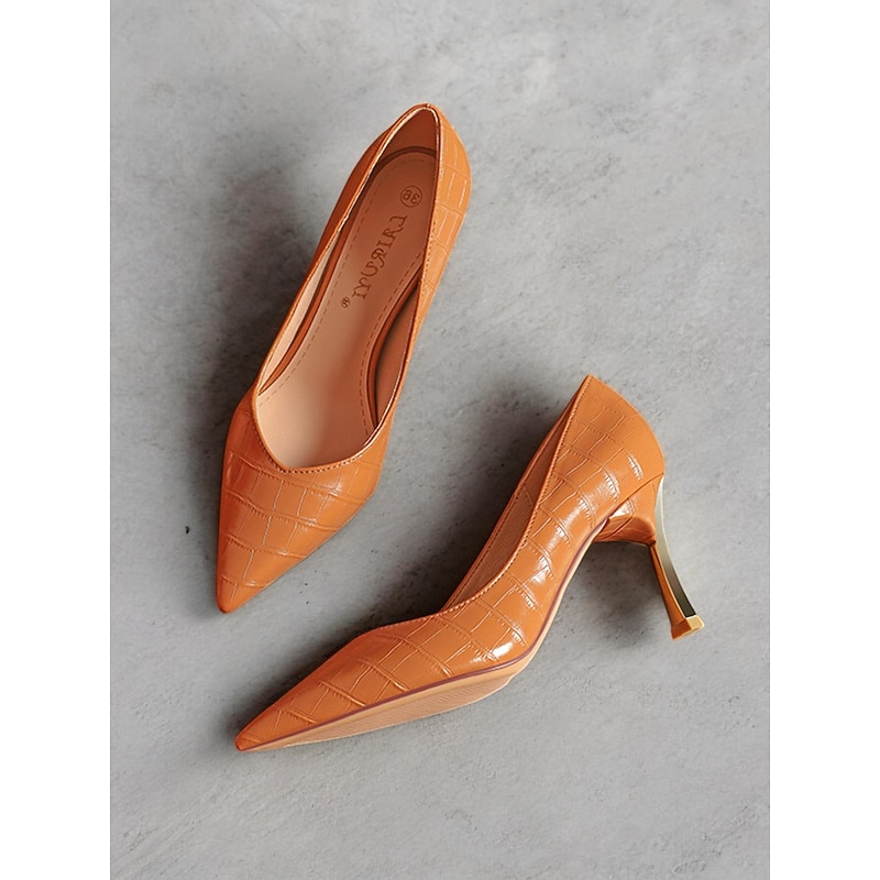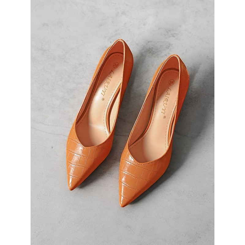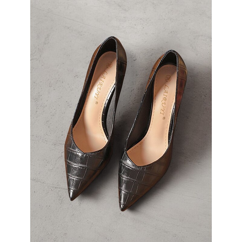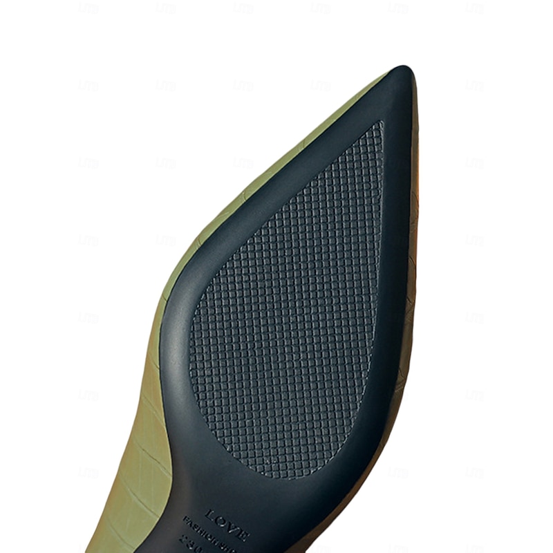 Highlights [Fabric] These elegant pumps are crafted from crocodile-embossed faux leather, providing a luxurious texture and sophisticated appearance. [Design Highlights] The shoes feature a pointed toe and are equipped with a metallic stiletto heel that enhances their stylish allure. The interior is lined with a cushioned material for comfort, making them suitable for extended wear. [Occasions] Perfect for work, office settings, and daily wear, these versatile pumps can easily transition from professional environments to evenings out, complementing dresses and tailored pants alike. [Design Details] The crocodile-embossed pattern adds an exotic charm, while the green color gives a unique and fashionable statement, producing an ideal blend of elegance and modern style. [Size Range] Available in sizes from US5.5 to US10.5, ensuring a perfect fit for a variety of customers.