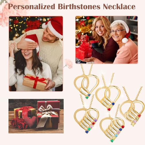 10K 14K 18K Gold Personalized Mothers heart Necklace with 2-6 Birthstones Custom Engraved Names Mom Pendant Christmas Gift for Her Wife 5
