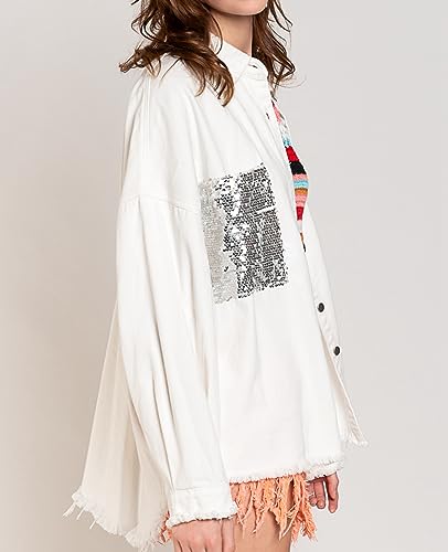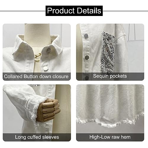 • Features: Women's trendy denim jacket, two sequin chest pocket, fringed hem, loose fitted, long sleeve, single-breasted buttons, lapel collar.