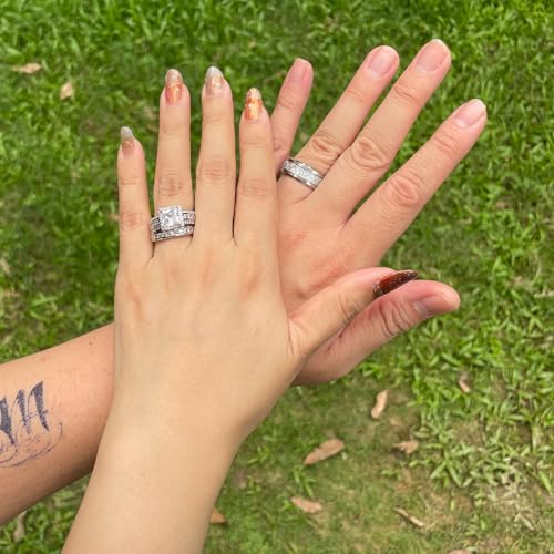 • Delicate Design- Womens ring is made of brass with white gold plated. Center stone is set with 1.25 carat princess cut AAA cubic zirconia. Mens ring is made of stainless steel.Brushed matte finished mens titanium wedding ring stainless steel wedding bands comfort fit with stepped edge and grooved.