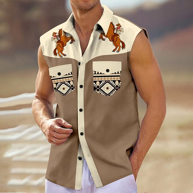 HOT ! Men's Horse Southwestern Print Shirt Western Shirt Cowboy Shirt Sleeveless Western Style Tribal Outdoor Work Causal Summer Spring Shirt Collar Black Khaki