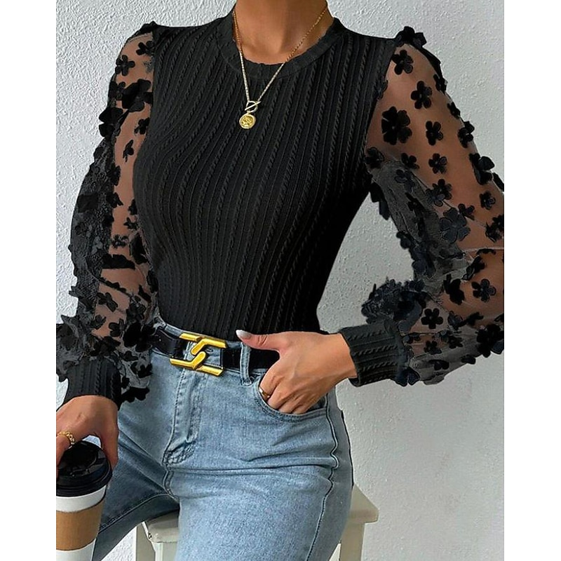 Highlights [Fabric] Crafted from high-quality chiffon and polyester, this women's blouse offers a lightweight and breathable feel, making it perfect for warm weather wear in spring, summer, and fall. [Fit] Designed with a form-fitting silhouette, the blouse provides a sleek and modern look, ensuring comfort and style for any occasion. [Design Highlights] The blouse showcases a sophisticated crew neck and striking lantern sleeves, adding a touch of elegance and charm. The intricate mesh patchwork design on the sleeves further accentuates the blouse's contemporary appeal. [Occasions] Perfect for work, social gatherings, or a stylish day out, this versatile top easily complements any wardrobe. Pair it with high-waisted jeans or a sleek skirt for a polished, fashionable look. [Size Range] Available in a variety of sizes, including S, M, L, and XL, to ensure a comfortable and flattering fit for a diverse range of body types.