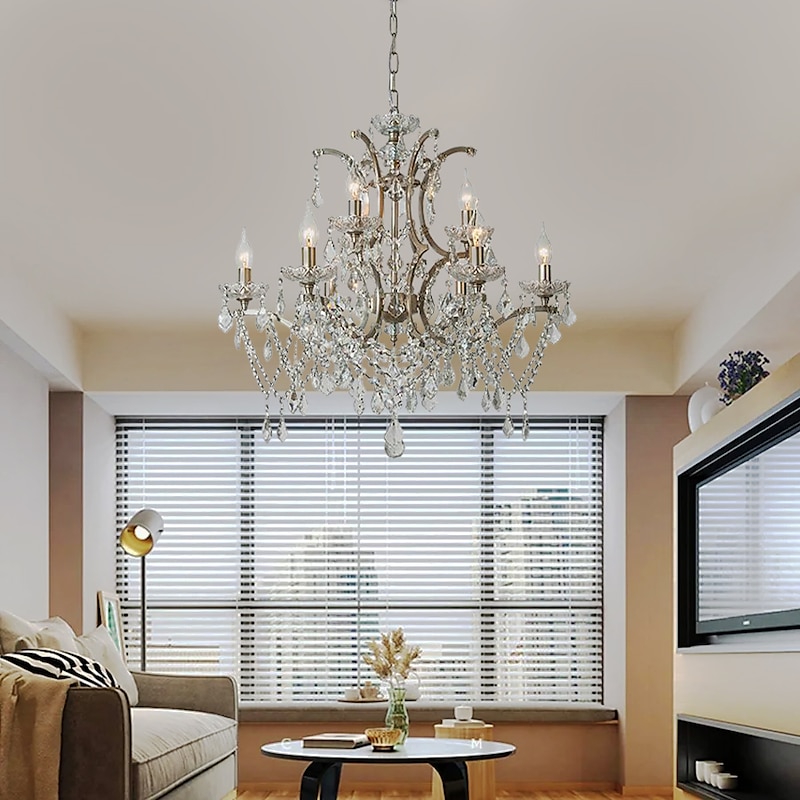 Chrome Silver Large Chandelier Lighting 43/61/68cm Wide Clear Crystal Tiered 12-Light Fixture for Dining Room House Foyer Entryway Kitchen Bedroom Living Room High Ceilings 110-240V 9