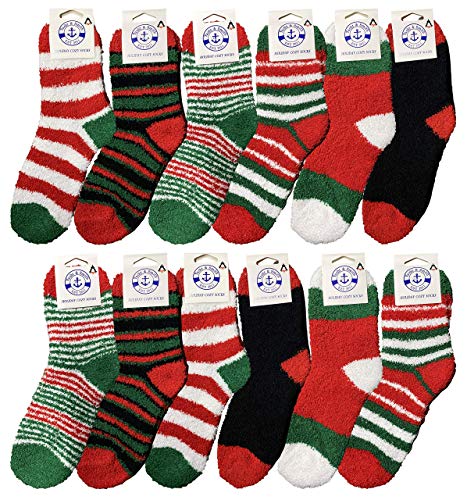 • 12 PACK OF WOMENS ASSORTED CHRISTMAS PRINTED CREW FUZZY SOCKS: These striped socks come in a variety colors and patterns featuring santa clause, snowflakes, snowmen, and more! Colorways include red, green, gray, black, white, and more.