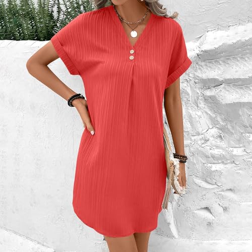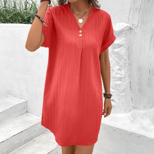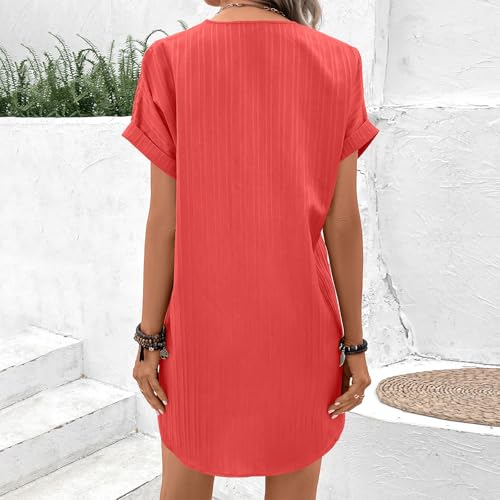 HOT ! Women V Neck Short Sleeve Dress Casual Trendy Henley Neck Loose Summer Solid Lightweight Beach Vacation Mini Dress