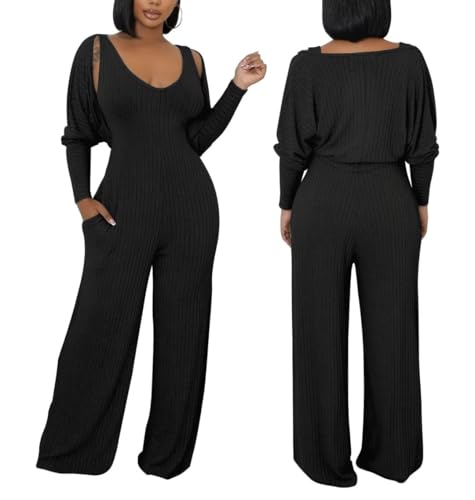 Annystore Sexy 2 Piece Set for Women Fall Outfit Ribbed Knit Long Sleeve Crop Cardigan Wide Leg Pants Set Jumpsuit Clubwear
