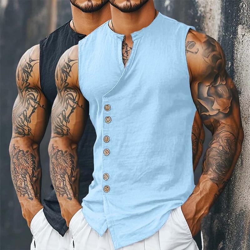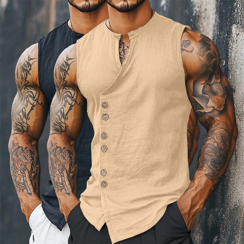 More information about Men's Shirt Linen Shirt Summer Shirt Beach Shirt Vintage Shirt Sleeveless Shirt Plain Daily Streetwear White+khaki Khaki+Black Blue+Khaki White+Black Sleeveless Mandarin Collar Summer Spring Clothing