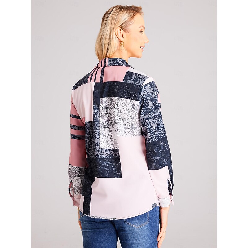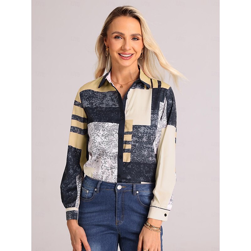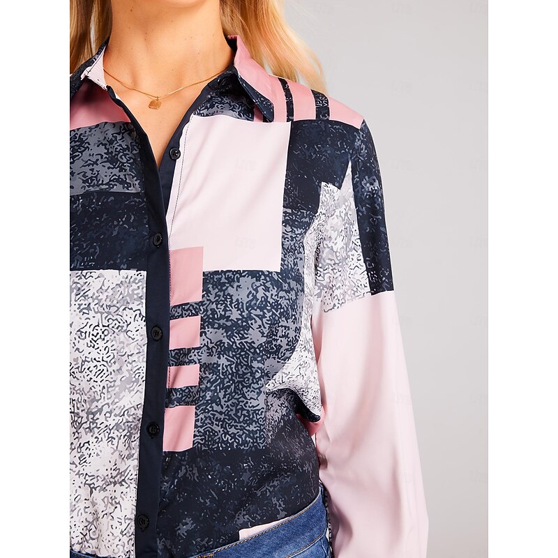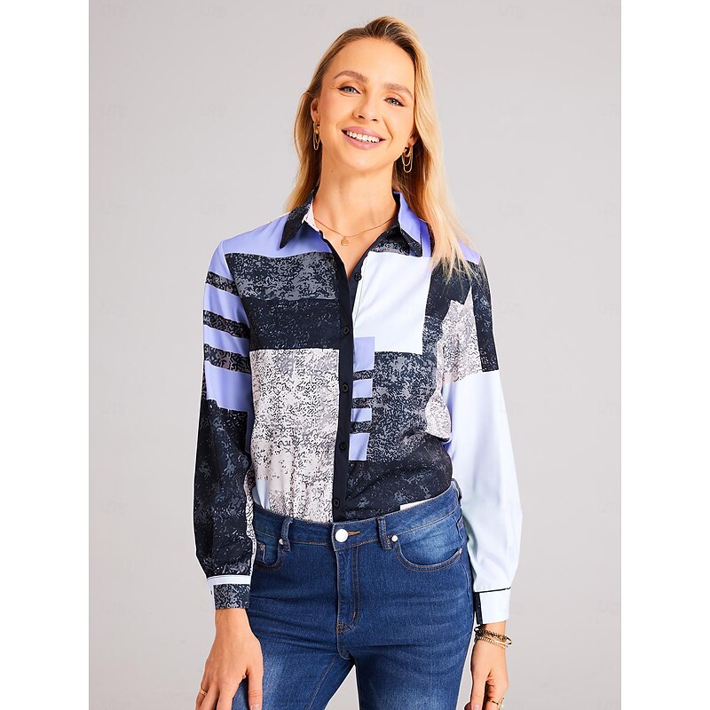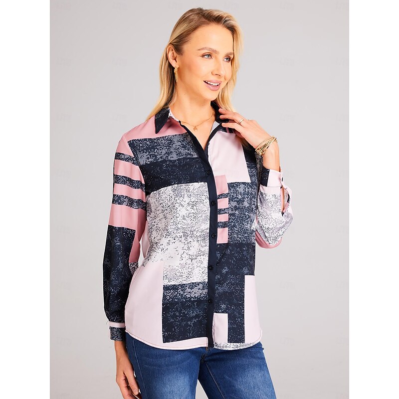 Highlights [Fabric & Material] Crafted from high-quality polyester, this women's blouse ensures a lightweight and breathable experience, making it ideal for both spring and fall seasons. [Fit & Style] Designed with a regular fit, this blouse features long sleeves, providing a comfortable and relaxed wear. The micro-elastic fabric offers ease of movement, perfect for casual and smart-casual settings. [Design Highlights] This shirt boasts a striking color block pattern with a modern touch of 3D print. It includes a classic shirt collar and button-down front, adding a sophisticated flair to its overall appeal. [Occasions] Perfect for various occasions, from casual day outs to more polished smart-casual events. Pair it with jeans or tailored pants to create a chic and versatile look suitable for both work and leisure. [Size Range] Available in a wide range of sizes from S to 5XL, ensuring a great fit for different body types.