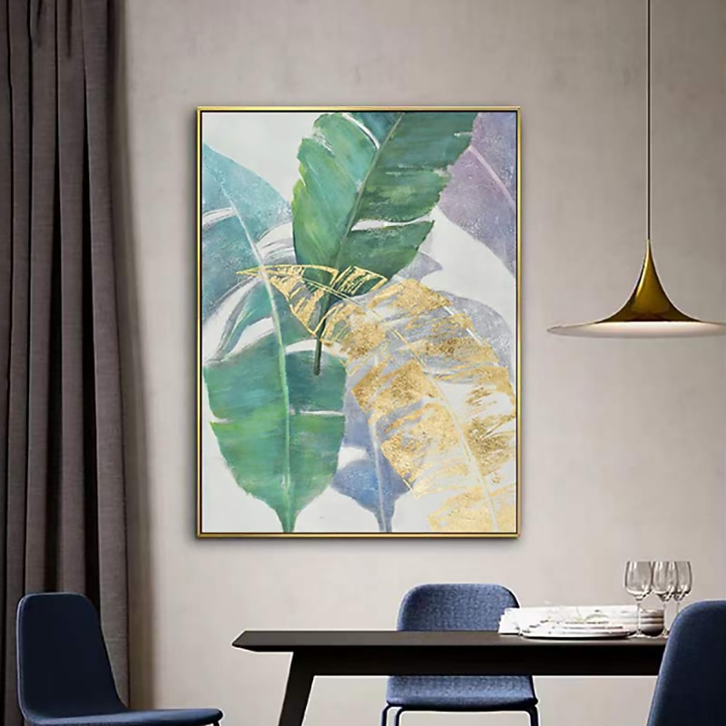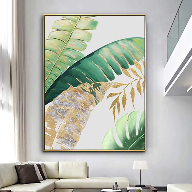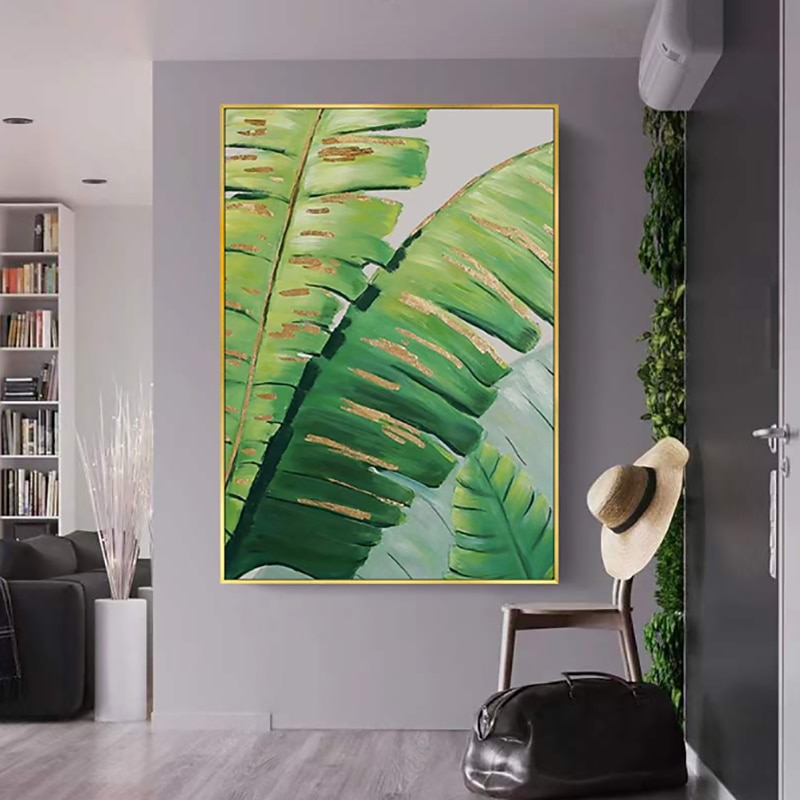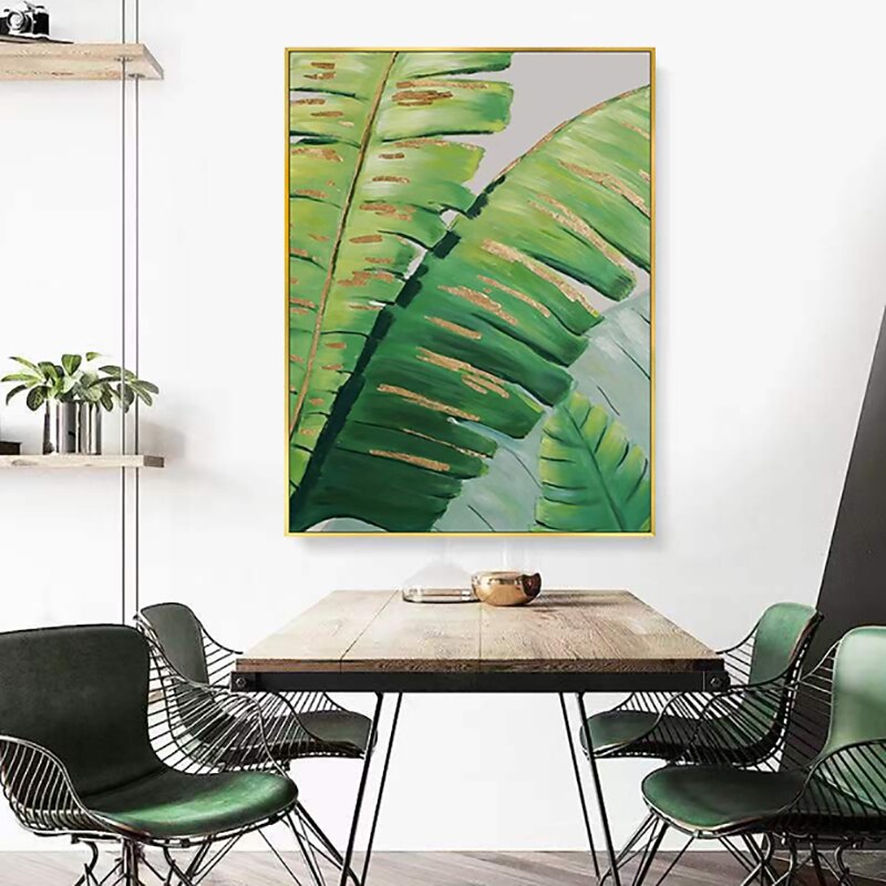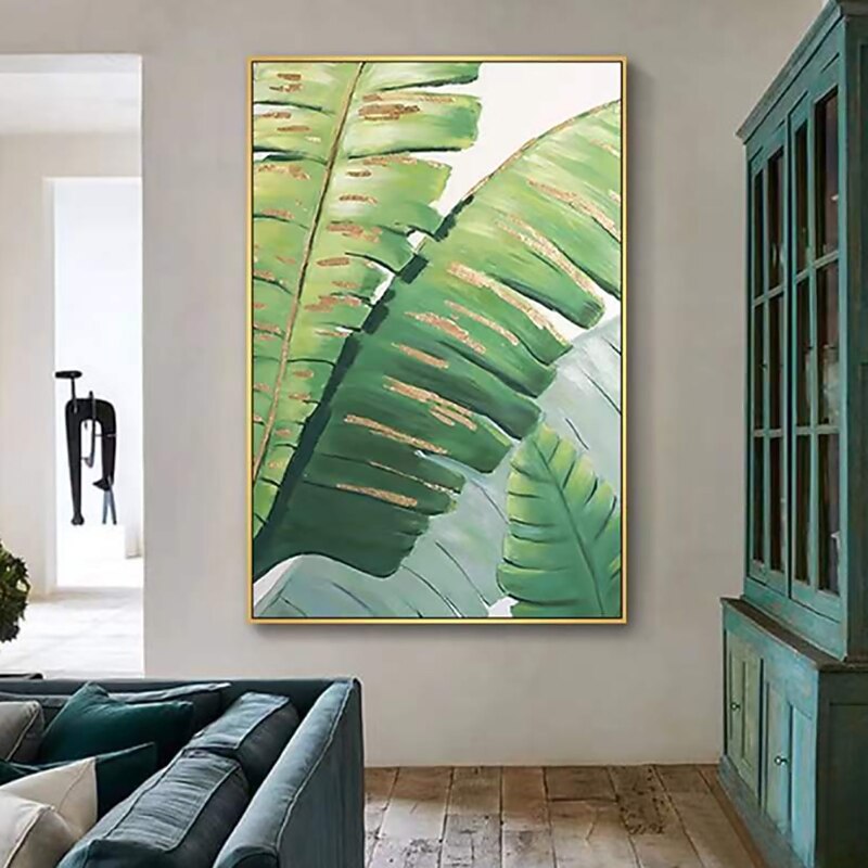 Handmade Oil Painting Canvas Wall Art Decoration Modern Abstract Plant Flower Green and Gold Banana Leaf for Home Decor Rolled Frameless Unstretched Painting 1