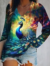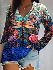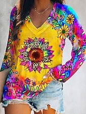 More information about Women's T Shirt Ombre Graphic Feather Elegant Bohemia Vintage Long Sleeve V Neck Regular Tops Daily Going out Weekend Print Yellow Pink Blue Spring Fall