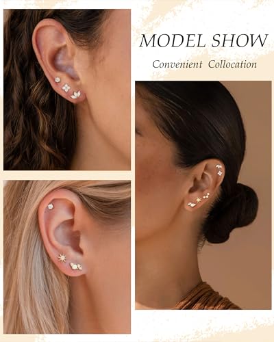 • GOLD STUD EARRINGS SETS GAUGE: 20G(0.8mm) pin thickness. Lightweight dainty earring sets for multiple piercing, such as cartilage earring, helix piercing jewelry, first, second, third lobe hole, tragus piercing jewelry, conch etc. Multiple dainty styles earring to match your ears flexibly. You can wear solo or stack them feel free to match your style