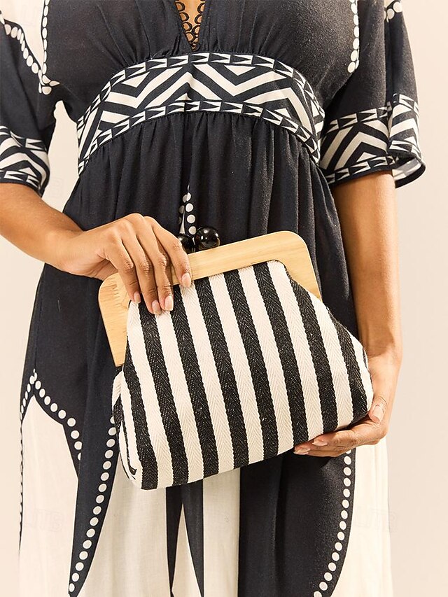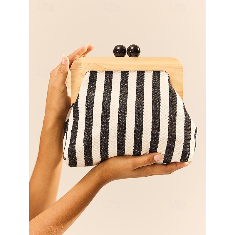 Women's Striped Canvas Crossbody Bag – Retro Wooden Frame Small Shoulder Purse with Adjustable Strap – Black and Beige, Ideal for Casual Outings and Travel 12