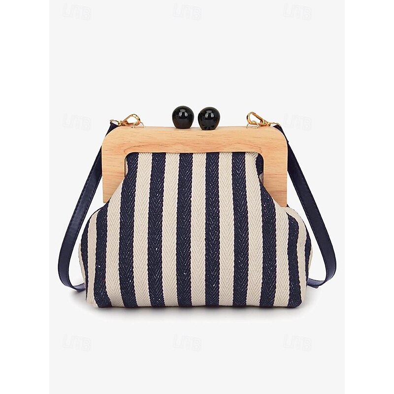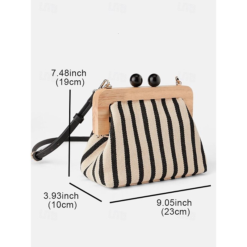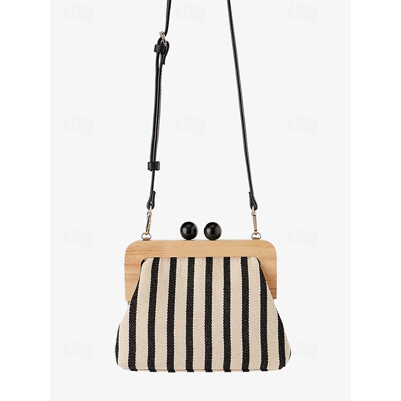 HOT ! Women's Striped Canvas Crossbody Bag – Retro Wooden Frame Small Shoulder Purse with Adjustable Strap – Black and Beige, Ideal for Casual Outings and Travel