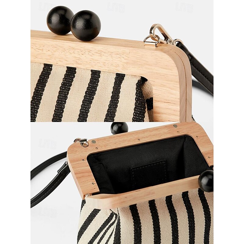 Women's Striped Canvas Crossbody Bag – Retro Wooden Frame Small Shoulder Purse with Adjustable Strap – Black and Beige, Ideal for Casual Outings and Travel 1