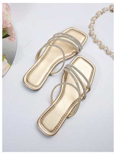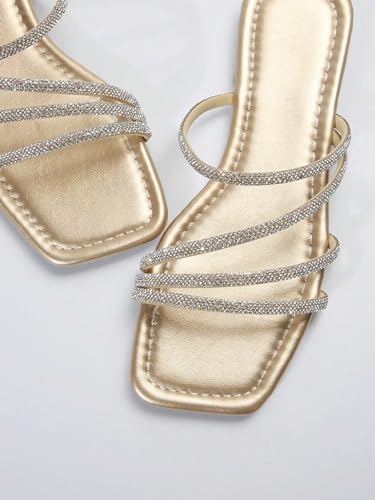 OYOANGLE Women's Rhinestone Flat Sandals Strappy Slip on Open Toe Slide Sandals Squared Slippers 6