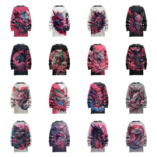 HOT ! Long Hooded Cardigan Men Japanese Neon Art Graphic Open Front Zip Up Fleece Warm Fall Novelty Lightweight Coat