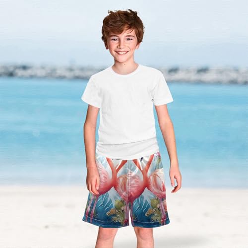 OREZI Boys Swim Trunk Two Pink Flamingo in Love with Flowers Bathing Suit Swim Shorts for Toddler Kids Teens 4