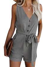 Highlights [Fabric] : Crafted from a premium polyester and cotton blend, this women's romper ensures a breathable and lightweight experience, perfect for spring and summer wear. The fabric offers a comfortable and soft feel, catering to all-day comfort. [Fit] : Designed with a regular fit, this romper complements various body shapes, providing both style and comfort. It features an adjustable waist with a fabric belt, allowing for a customized fit and enhancing the silhouette. [Design Highlights] : The romper showcases a chic V-neckline and a button-down front, adding elegance to its casual charm. Cuffed hems on the shorts lend a laid-back sophistication, while practical side pockets add a functional touch for carrying essentials with ease. [Occasions] : Ideal for daily wear and holiday outings, this versatile romper is a stylish choice for beach days, picnics, or any casual event. Pair it with sandals and a sunhat to complete the perfect summer look. [Size Range] : Available in a wide range of sizes from S to 5XL, this romper caters to various body types, ensuring a flattering fit for everyone.