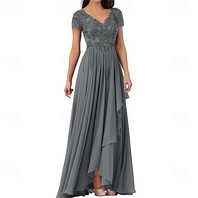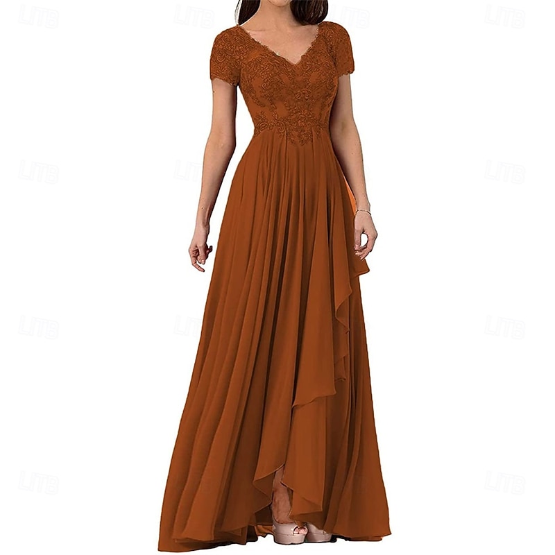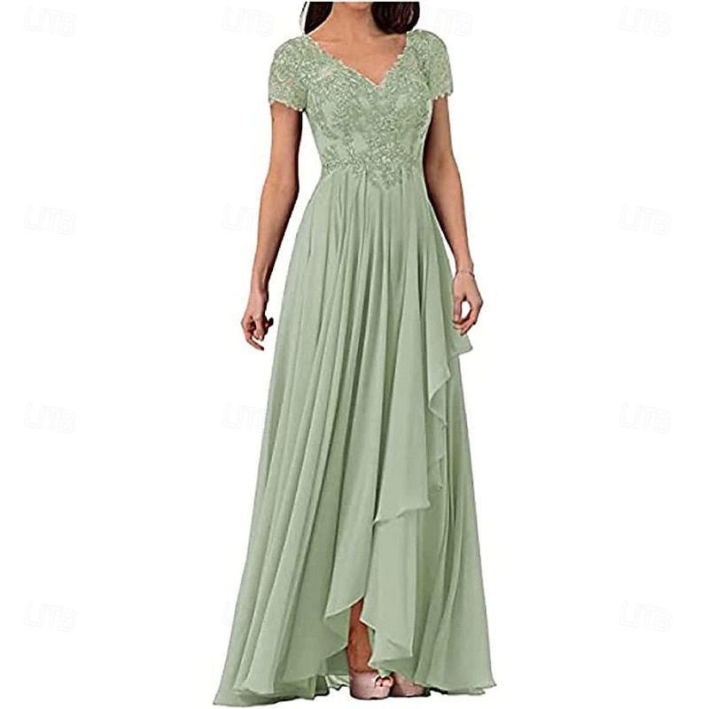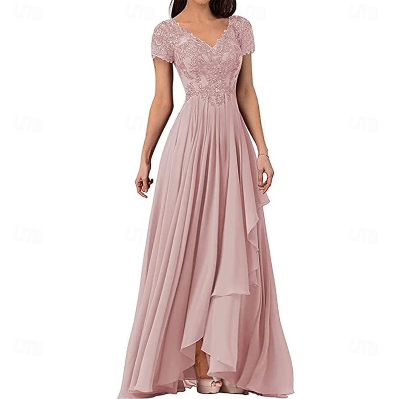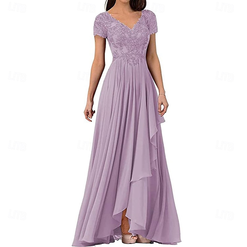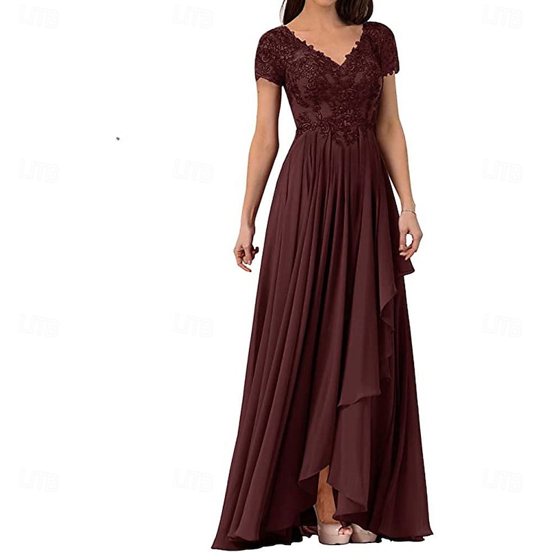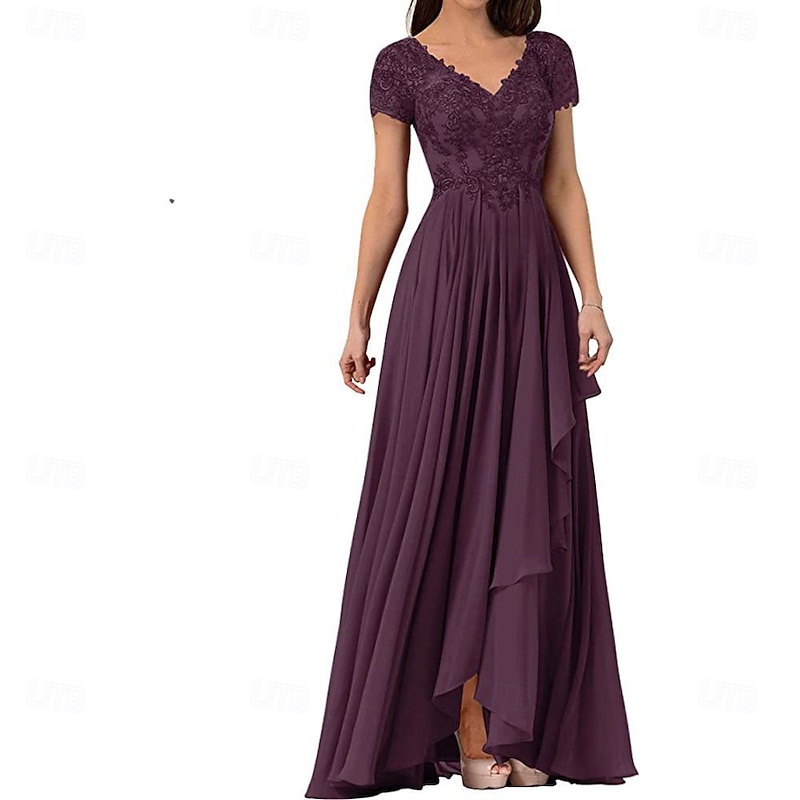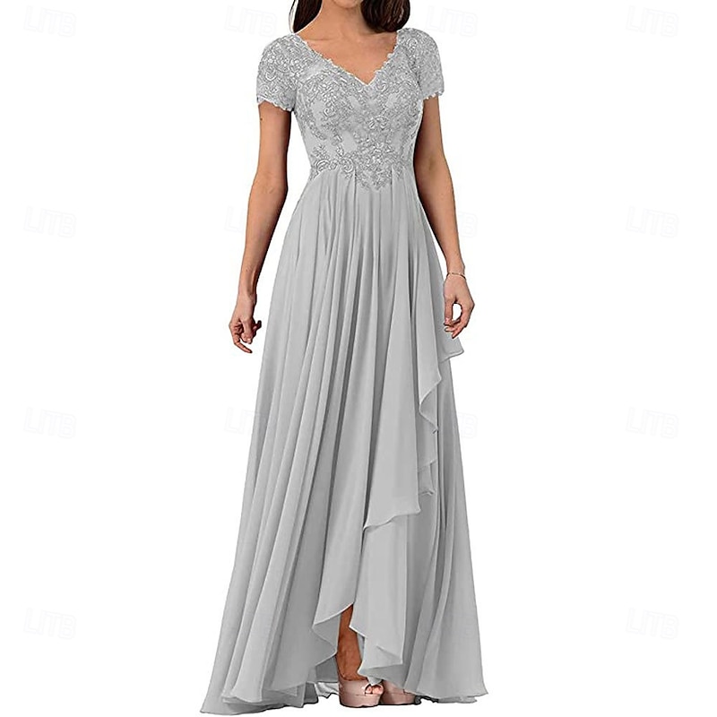 More information about A-Line Mother of the Bride Dress Elegant Simple V Neck Floor Length Chiffon Short Sleeve with Solid Color