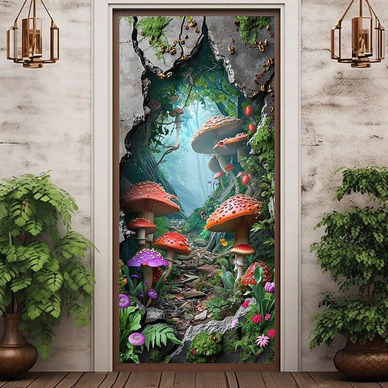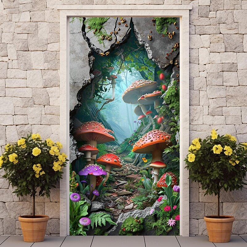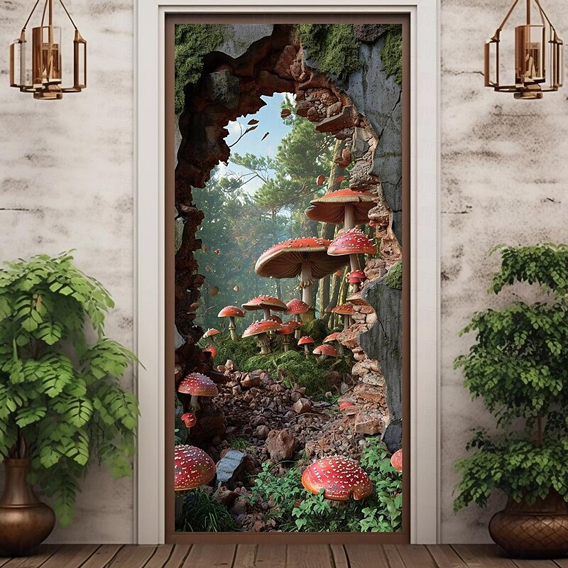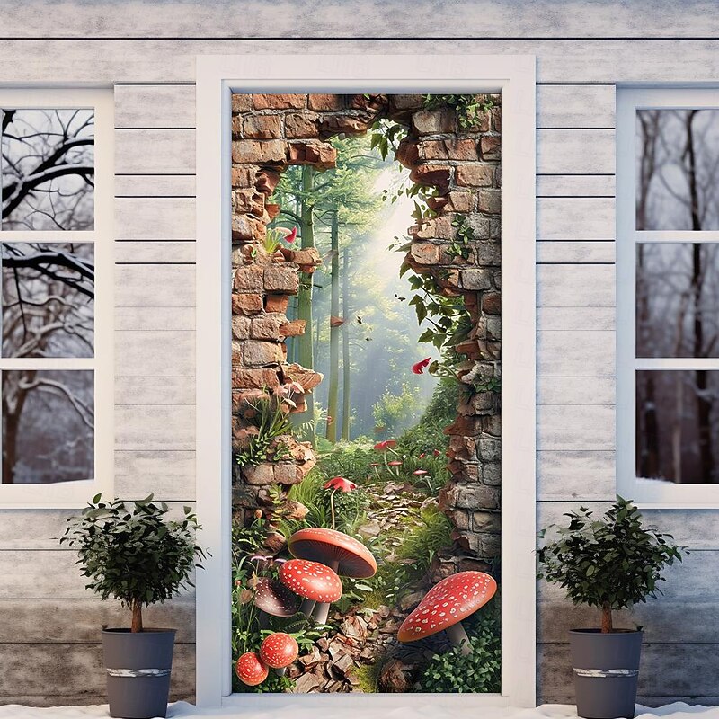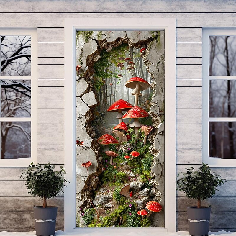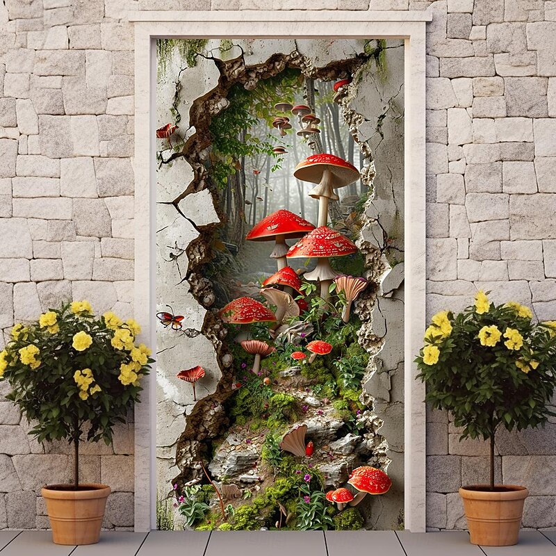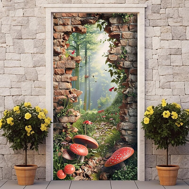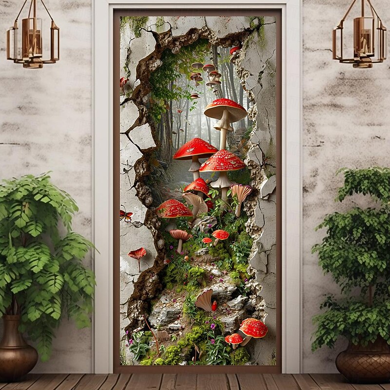 HOT ! Broken Wall Mushrooms Door Covers Mural Decor Door Tapestry Door Curtain Decoration Backdrop Door Banner Removable for Front Door Indoor Outdoor Home Room Decoration Farmhouse Decor Supplies
