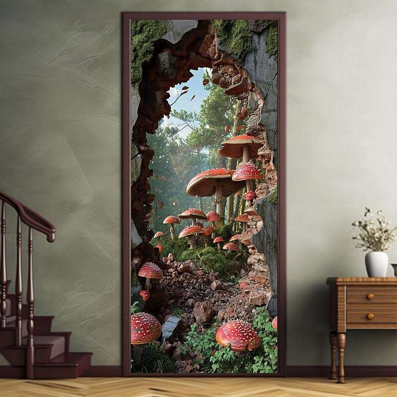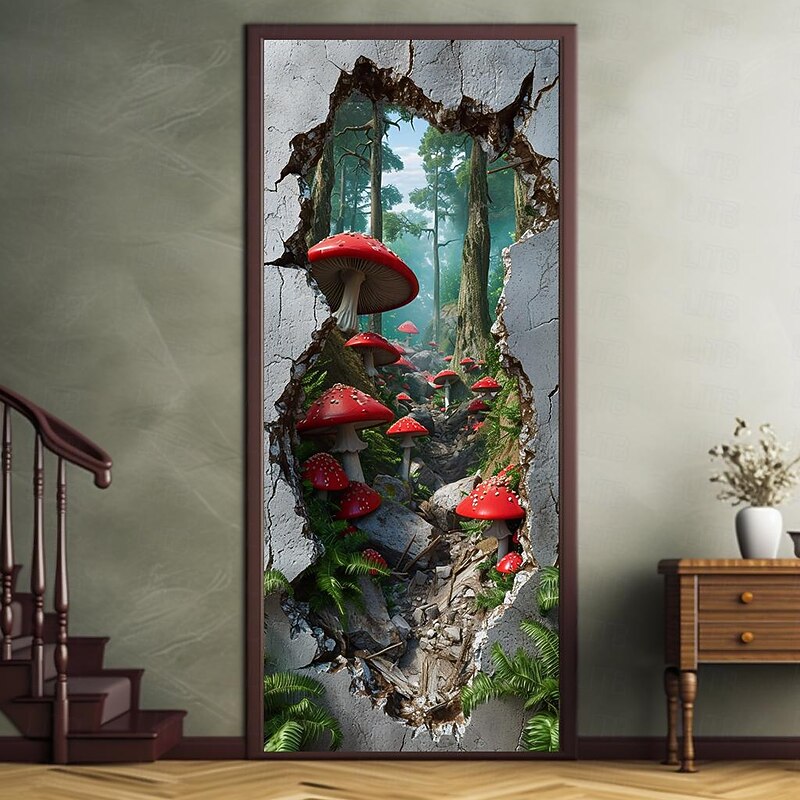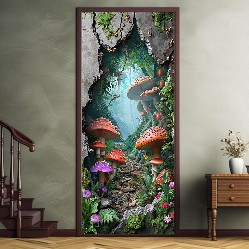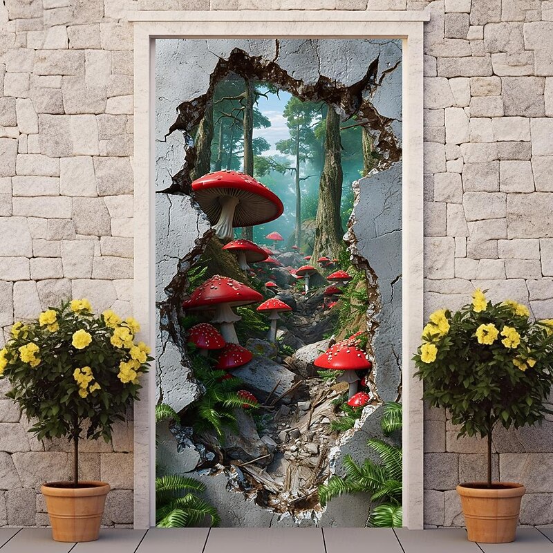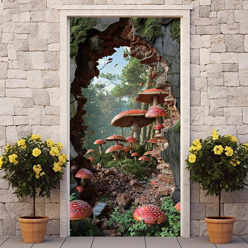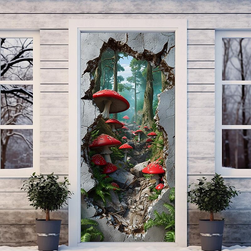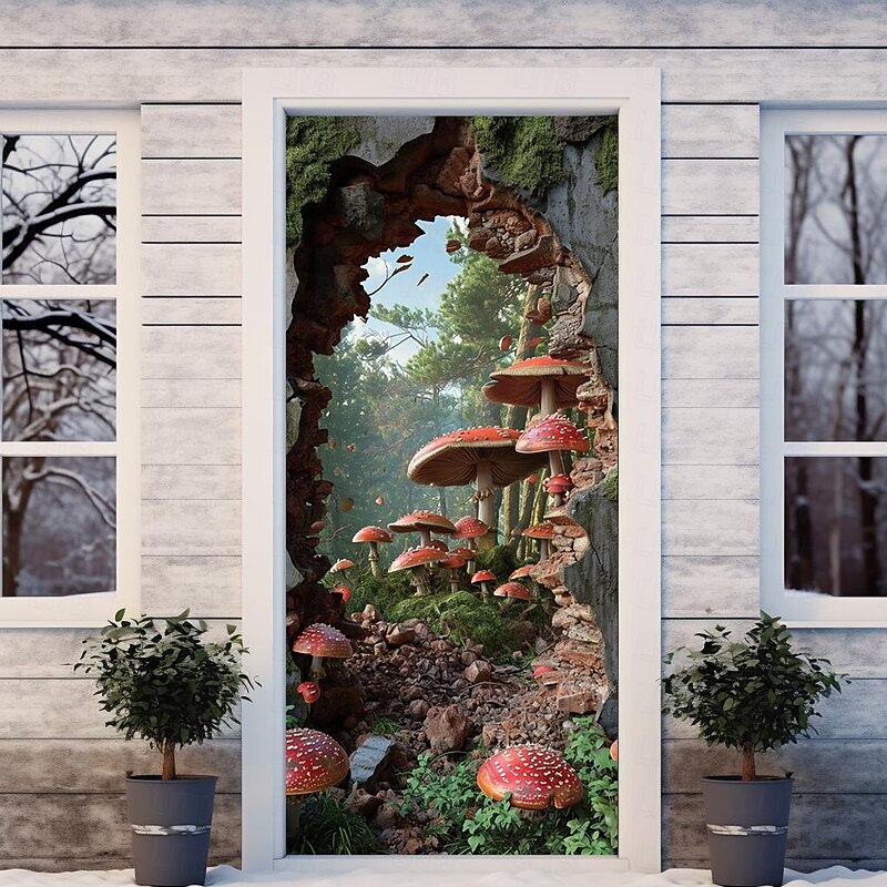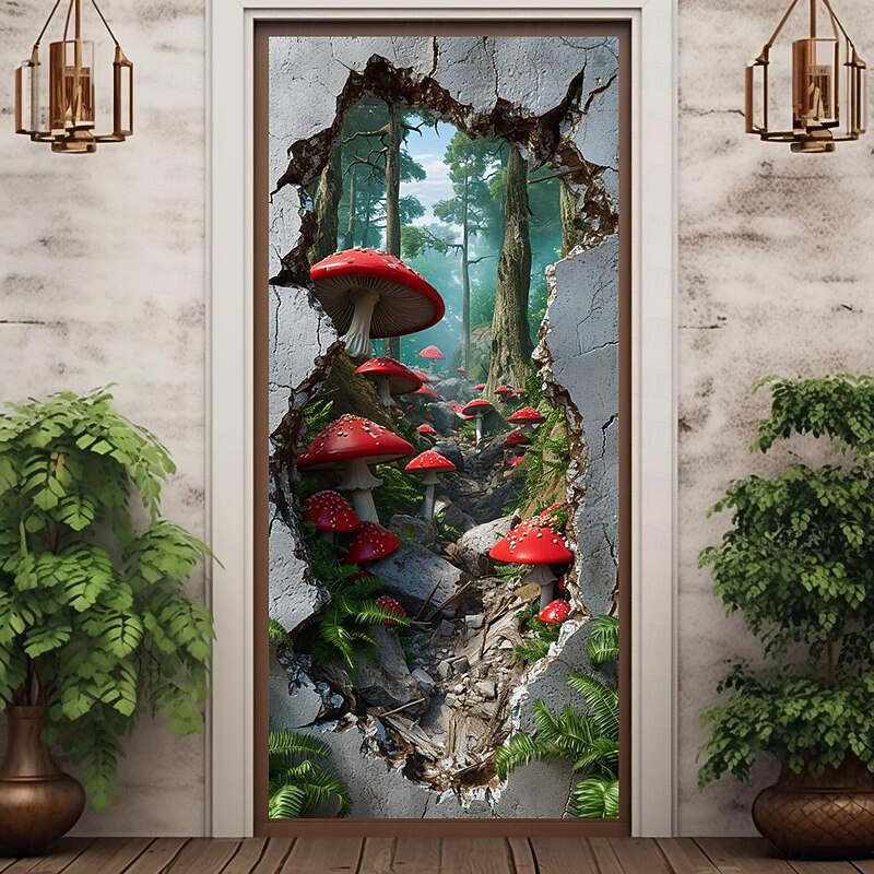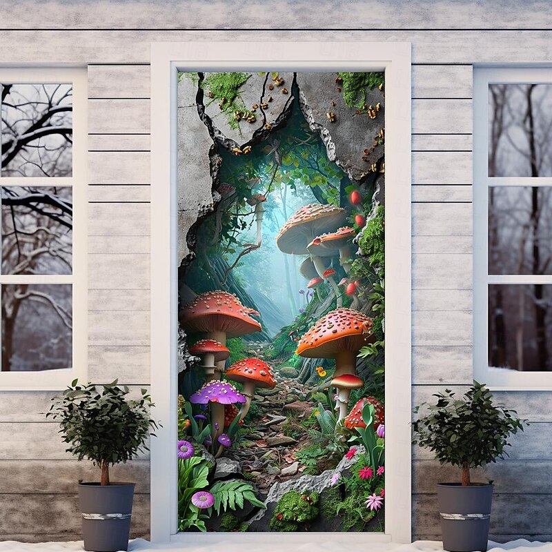 HOT ! Broken Wall Mushrooms Door Covers Mural Decor Door Tapestry Door Curtain Decoration Backdrop Door Banner Removable for Front Door Indoor Outdoor Home Room Decoration Farmhouse Decor Supplies