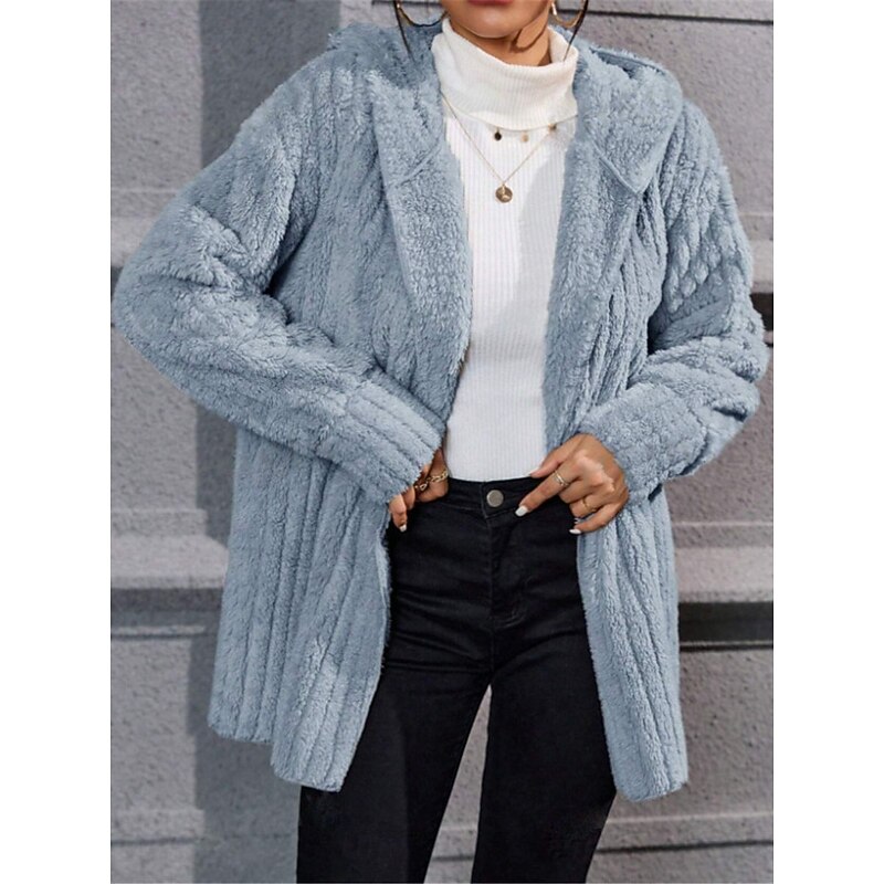 Highlights [Fabric]: Crafted from plush, faux Sherpa fleece, this women's teddy coat offers a cozy and luxurious texture combined with micro-elasticity. The soft material ensures warmth and comfort, perfect for the fall and winter seasons. [Fit]: Featuring a relaxed, regular fit, this jacket is designed for easy layering over various outfits. Its comfortable shape makes it a versatile choice for everyday wear. [Design Highlights]: The coat includes a fashionable hood for extra warmth and an open front design for effortless wearability. The subtle ribbed pattern adds a touch of elegance, enhancing its casual yet chic appeal. [Occasions]: Ideal for daily wear, vacations, street style, and casual outings, this teddy coat effortlessly complements a variety of occasions. Its neutral color options of blue and khaki allow it to pair seamlessly with different styles and colors. [Size Notice]: Available in sizes S, M, L, XL, and 2XL, ensuring a fit for a range of body types. This outerwear piece is a must-have addition to any fashionable winter wardrobe. Perfect for everyday use. superior materials and excellent craftsmanship ensure long-lasting durability.