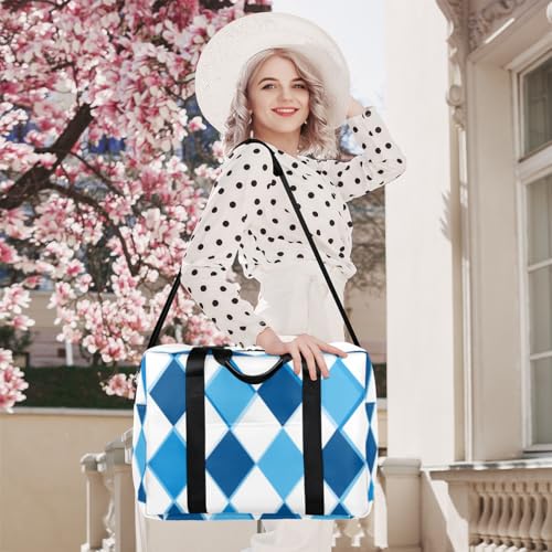 HOT ! Blue Rhombus Travel Duffel Bag for Men Women White Argyle Sports Gym Bag Waterproof Weekender Overnight Bags Foldable Carry on Backpack for Swim Yoga Fitness Workout