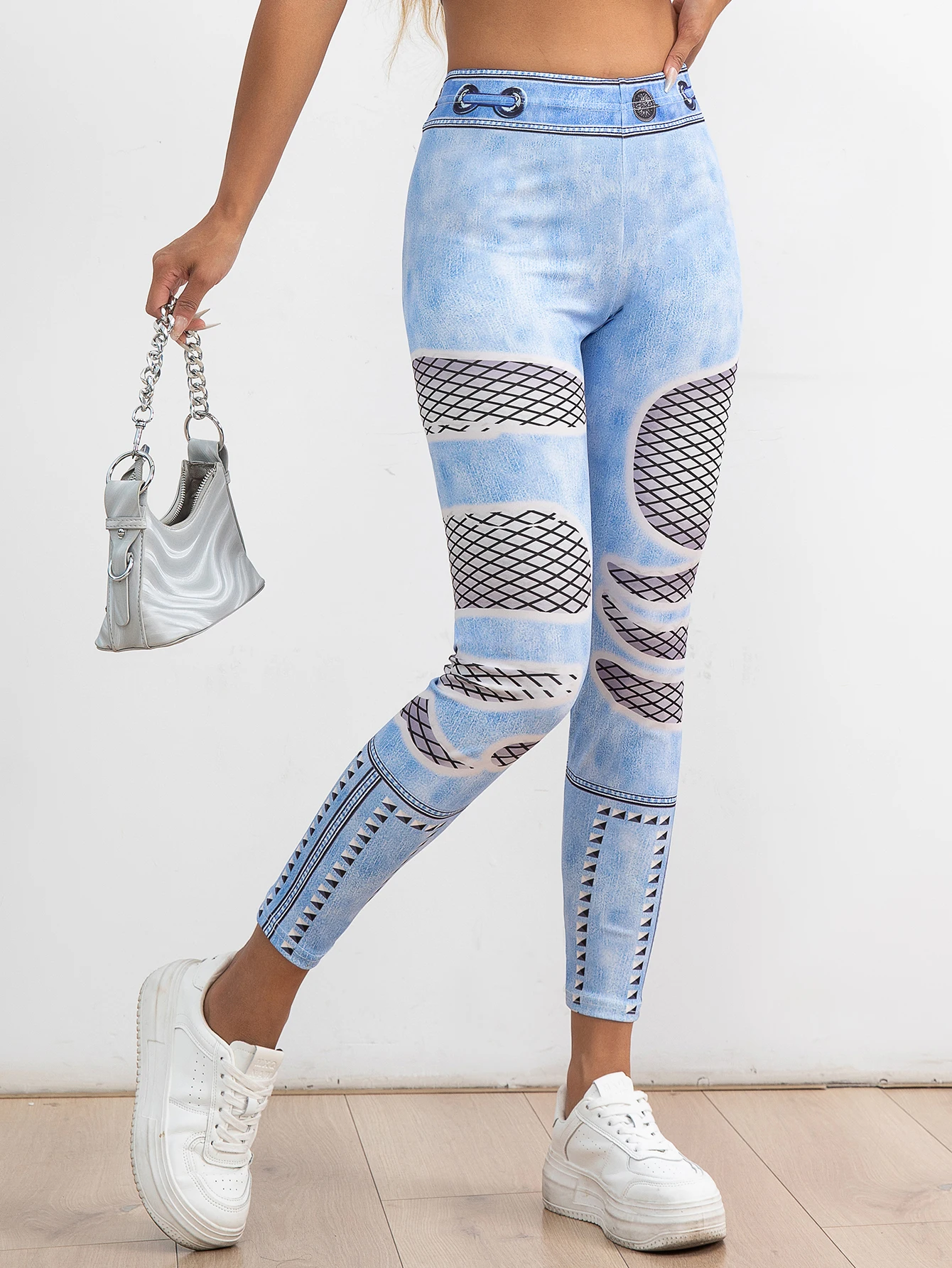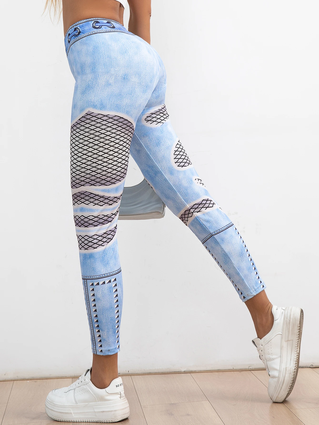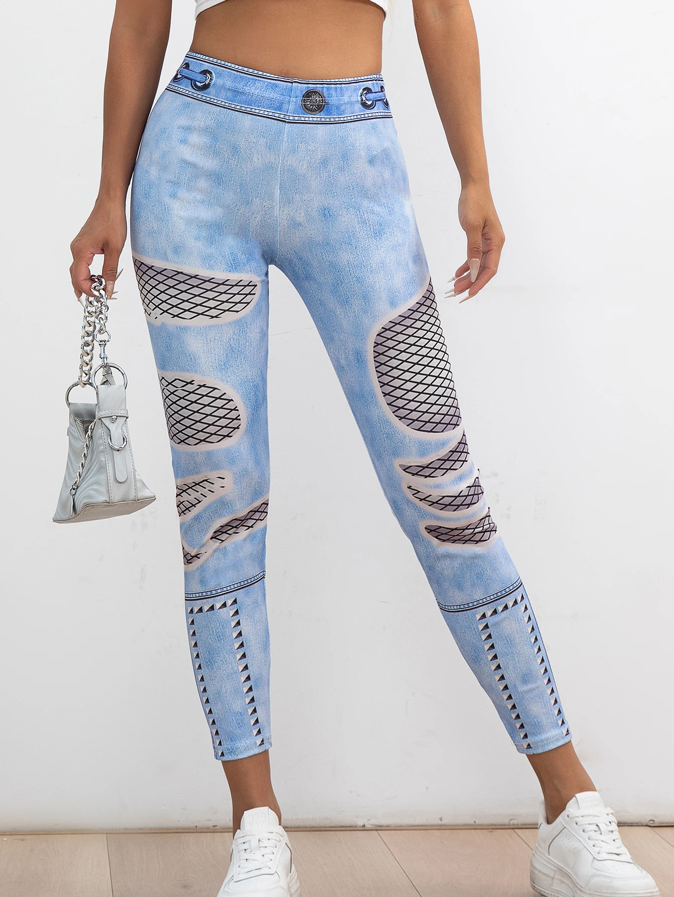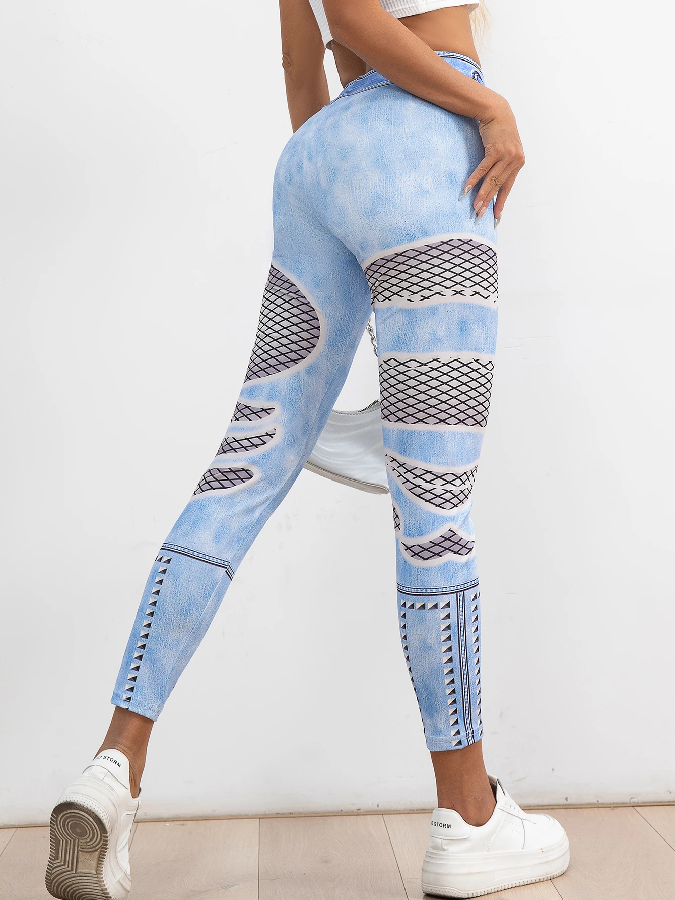 New Europe And The United States Tight Nine-point Pants Women Fashion Trend Weaving Mesh Imitation Denim Hip Lift Leggings Women