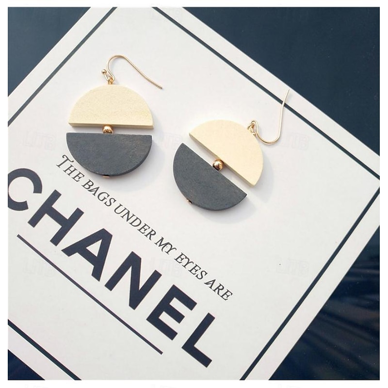 Highlights [Material:] Crafted from high-quality resin, these earrings present a lightweight design that ensures comfort for all-day wear, making them an ideal choice for any outfit. [Shape:] Featuring a modern geometric design, these drop earrings combine two distinct semi-circular shapes in an elegant and striking manner. The upper half showcases a smooth cream color, while the lower half contrasts with a deep navy hue, offering a sophisticated polished finish. [Design Highlights:] The gold-tone hooks add a touch of elegance to the earrings, enhancing their overall luxurious appeal. Their minimalist yet eye-catching appearance makes them versatile accessories, suitable for both casual and formal occasions. [Occasions:] Perfect for a variety of events, these earrings are an excellent choice for parties, evening wear, dates, and birthday celebrations. Their chic style effortlessly transitions from daytime elegance to evening sophistication. [Size Notice:] Designed exclusively for women, these drop earrings are available in a standard one-pair quantity. Their versatile aesthetic ensures they complement different personal styles, making them a thoughtful and stylish gift option.