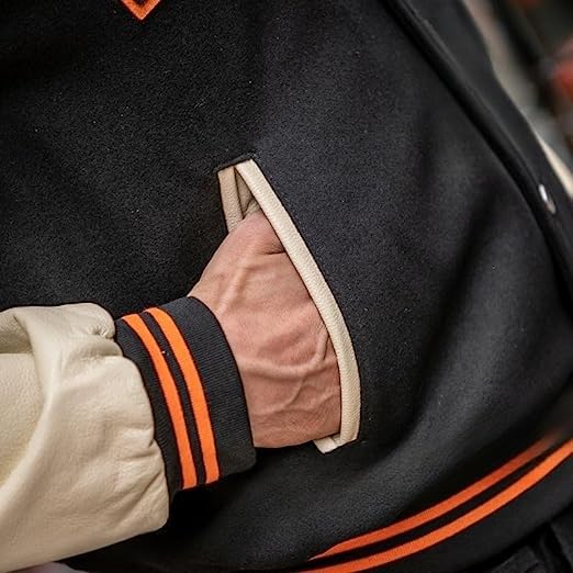 • This letterman Varsity Jacket has front Button Closure, Cuffs and the Hemline also Knitted to give it style with comfort. This Motorcycle jacket has Premium Viscose Inner Lining with 2 Inside and 2 Waist pockets