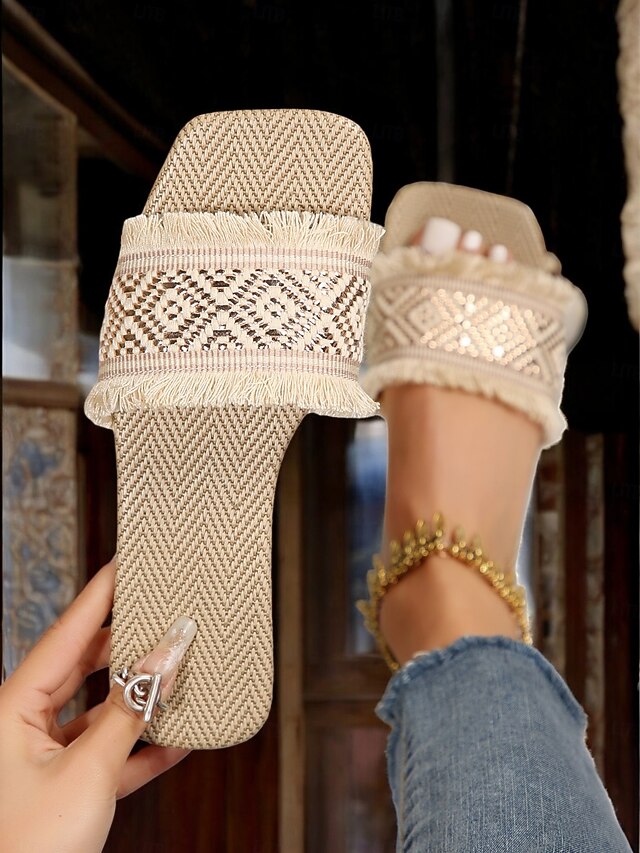 HOT ! Women's Boho Fringe Slide Sandals – Woven Open Toe Slip-On Shoes for Casual Summer Beachwear and Vacation