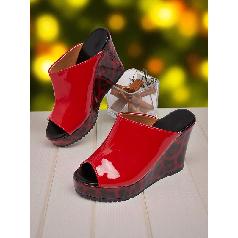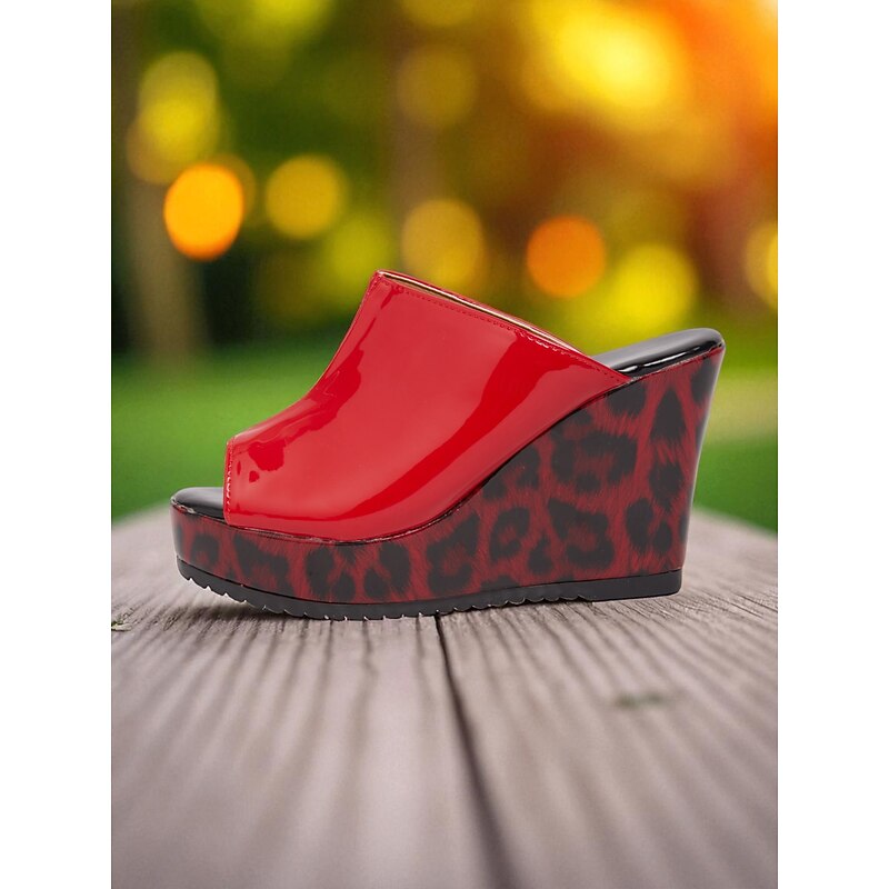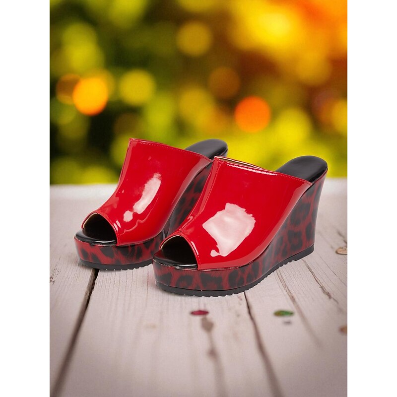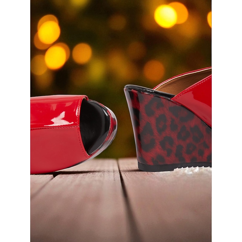 Women's Red Patent Leather Wedge Sandals - Peep Toe Leopard Print Platform Party Shoes for Nightlife and Clubwear 1