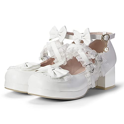Elerhythm Women's Mary Jane Platform Chunky Block Heels Cute Cosplay Kawaii Bow Lace Dresses Cross-Tied Round Toe Ankle Strap Shoes 6