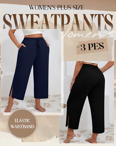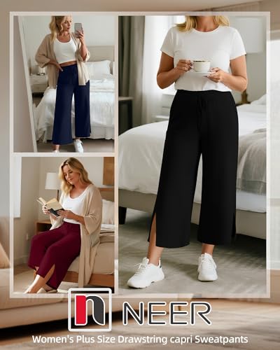 Neer 3 Pack Women's Plus Size Capris, Drawstring Cropped Wide Leg Pants Lounge Athletic Yoga Sweatpant with Pocket