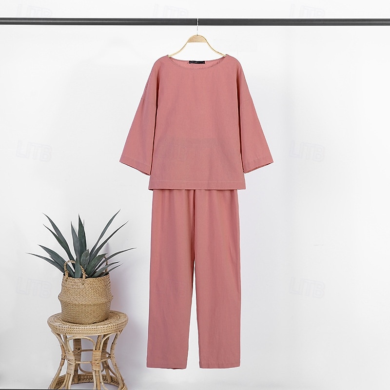 More information about Women's Active Basic Cotton Linen Shirts Blouse Pants Sets Long Sleeve Crew Neck Solid Color Outdoor Going out Pink Army Green Beige Summer Regular Fit