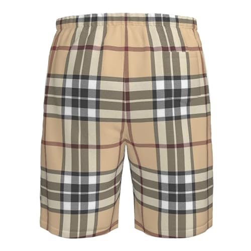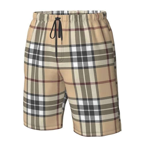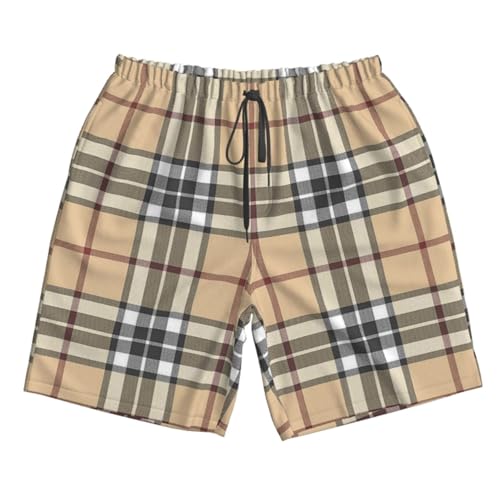 HOT ! Beige Plaid Tartan Checkered Boardshorts Men's Casual Swim Trunks Quick Dry Drawstring Beach Swim Shorts