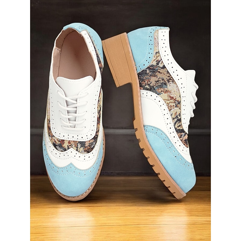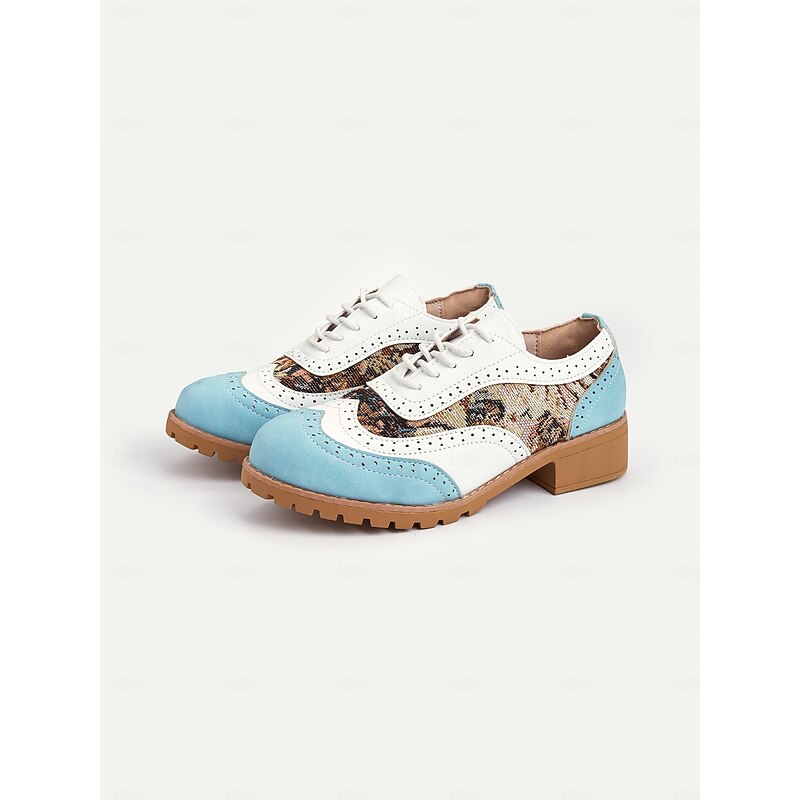 Highlights [Fabric and Construction] : Designed with high-quality PU and cloth materials, these Women's Retro Oxford Shoes feature a synthetic leather lining that enhances breathability and comfort throughout the day. The robust rubber outsole offers durable performance and excellent grip, ideally suited for various terrains. [Silhouette and Fit] : Boasting a timeless lace-up brogue style, these shoes provide a secure and adjustable fit. They feature a round toe shape and a low chunky heel that adds to their comfort, making them perfect for extended wear. [Design Highlights] : These oxfords stand out with their striking color block design, combining classic white leather with chic pastel blue suede accents. The midsection showcases a beautiful floral pattern, interwoven with sophisticated textures for an elegant, retro-inspired look. Traditional perforated brogue detailing adds a touch of classic charm. [Occasions] : Perfect for daily wear, work environments, or casual outings, these shoes transition seamlessly from professional settings to relaxed social events. Their stylish design offers versatility, making them a fashionable choice for any occasion. [Size Notice] : Available in a range of sizes from US6 to US10.5 (EU36 to EU42, UK4 to UK8.5). For the best fit, it is recommended to select your usual size.