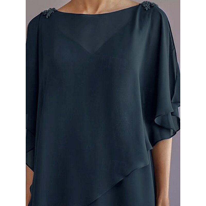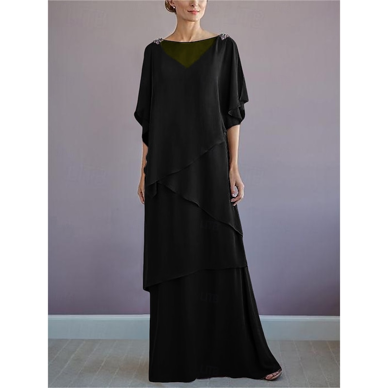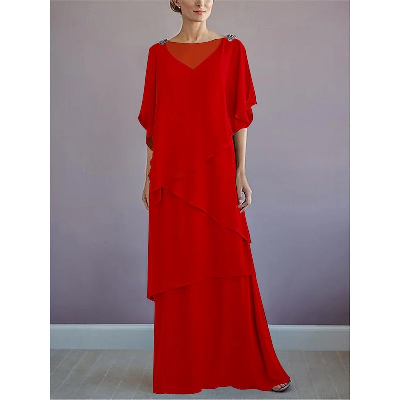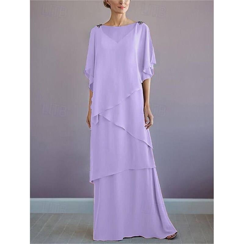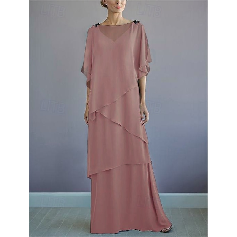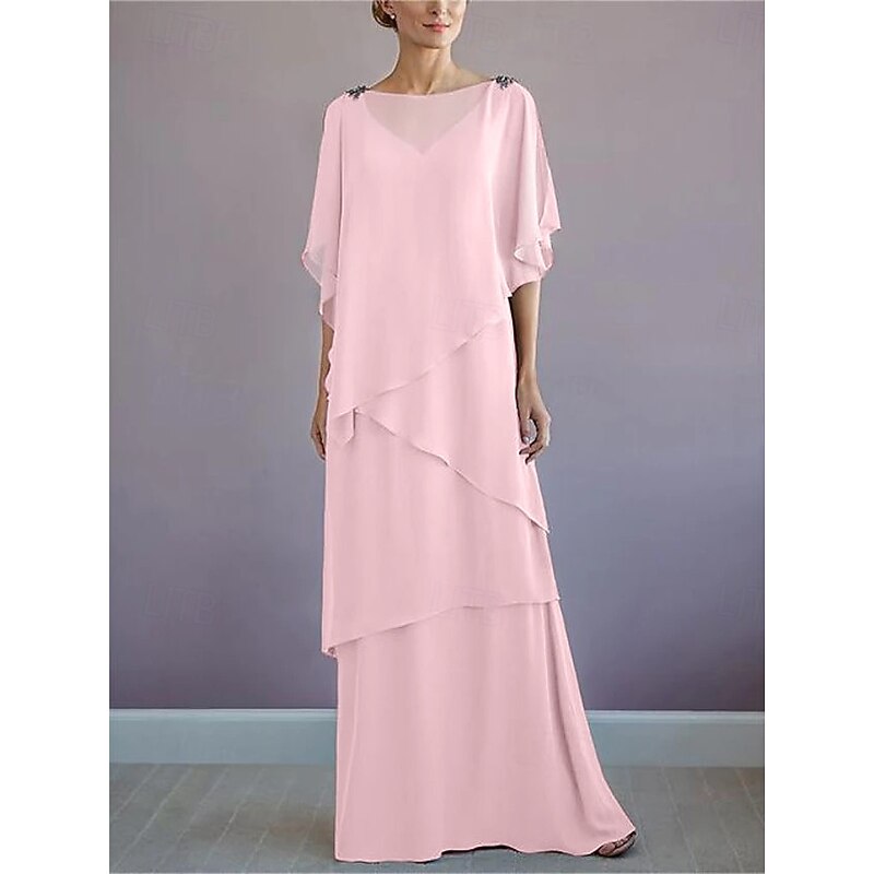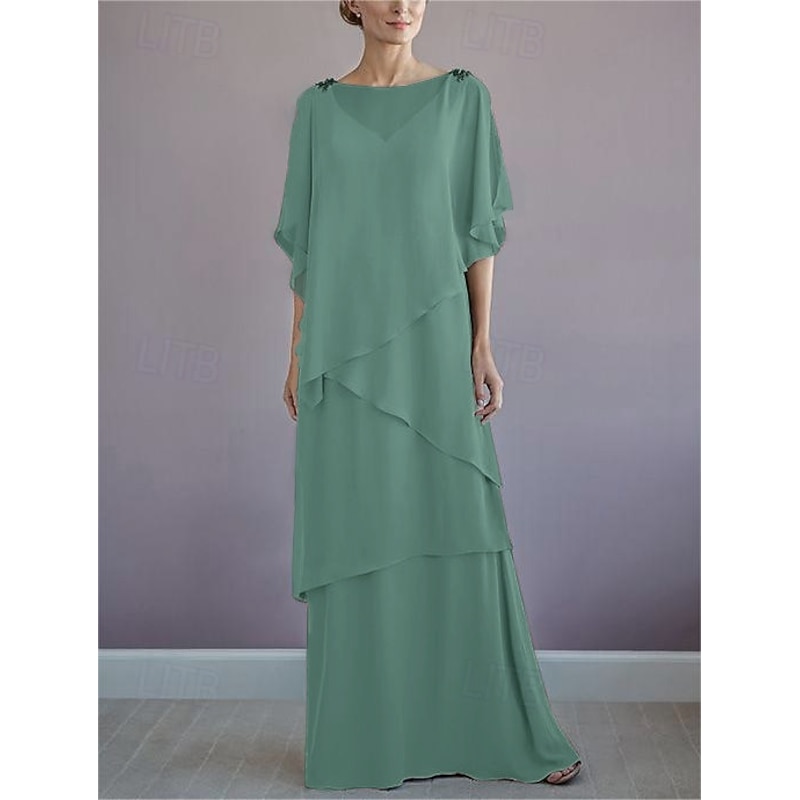 More information about Beach Wedding A-Line Mother of the Bride Dress Formal Wedding Guest Elegant Bateau Neck Floor Length Chiffon Half Sleeve with Ruffles Draping Tier