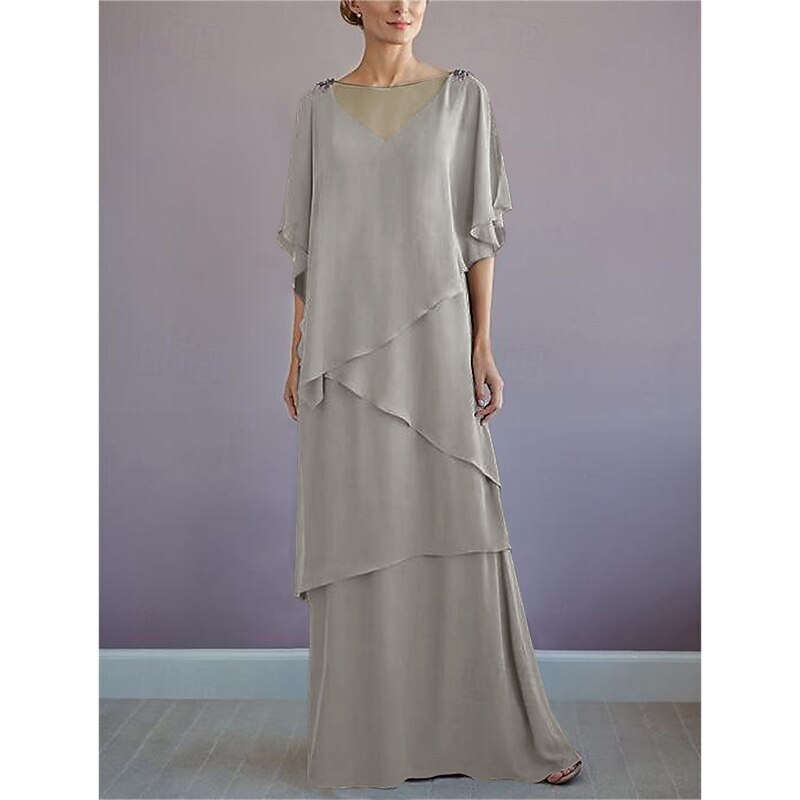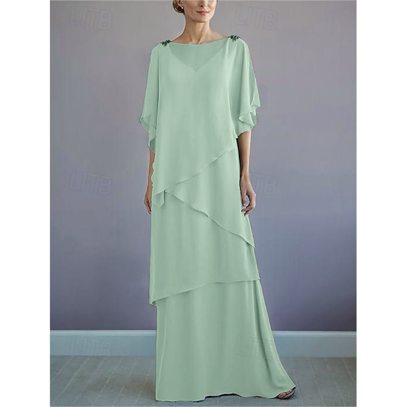HOT ! Beach Wedding A-Line Mother of the Bride Dress Formal Wedding Guest Elegant Bateau Neck Floor Length Chiffon Half Sleeve with Ruffles Draping Tier
