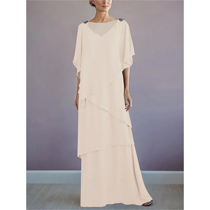 Beach Wedding A-Line Mother of the Bride Dress Formal Wedding Guest Elegant Bateau Neck Floor Length Chiffon Half Sleeve with Ruffles Draping Tier 4