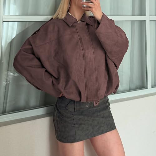 WOWULOVELY Women's Faux Suede Bomber Jacket Lapel Pilot Pocket Coat Casual Oversized Long Dolman Sleeves Trendy Streetwear 1
