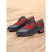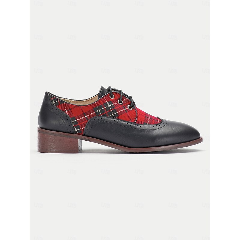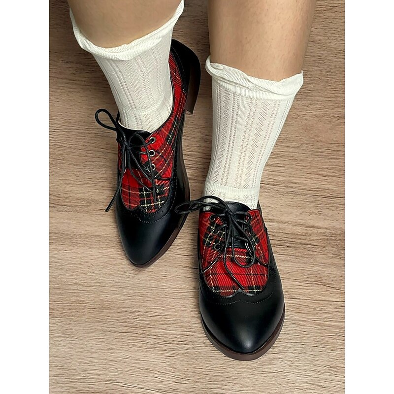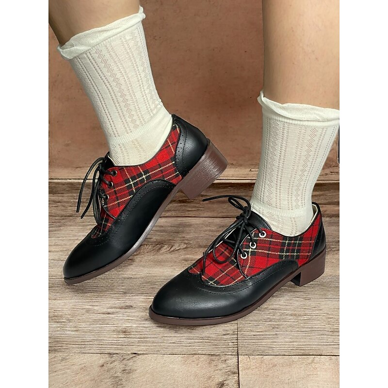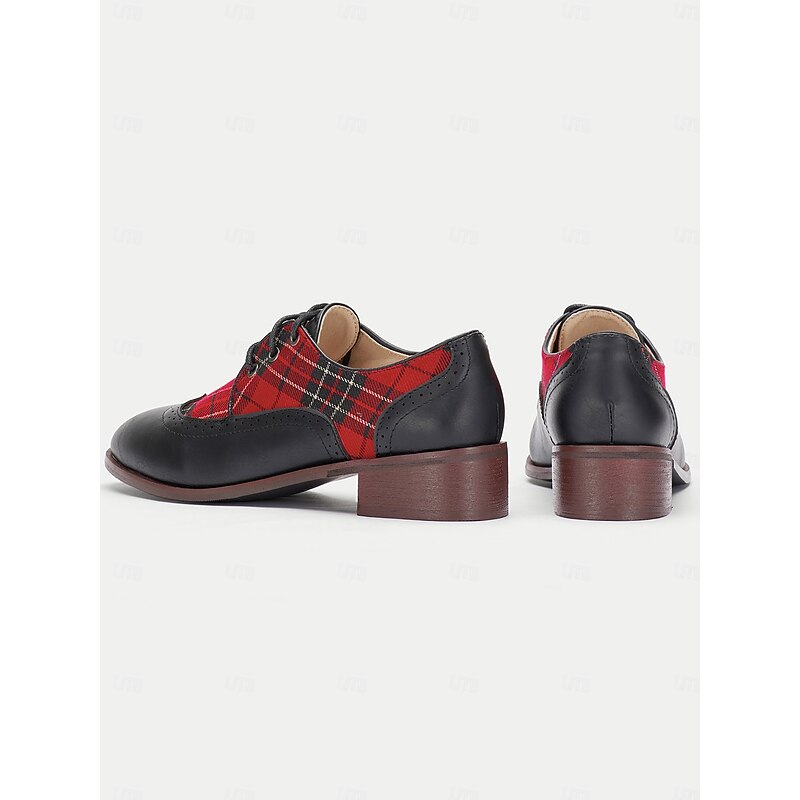 Highlights [Material Highlights] : Crafted from high-quality PU leather and classic plaid fabric, these oxford shoes showcase a unique blend of traditional and modern materials. The smooth leather and vibrant red tartan panels create a striking contrast, making them a standout addition to any footwear collection. [Fit & Structure] : These vintage-inspired shoes feature a rounded toe and a classic brogue design, offering both elegance and comfort. The lace-up closure ensures a secure fit, while the sturdy low block heel provides stable support for all-day wear. [Design Details] : The shoes boast British-style brogue detailing and sleek plaid patterning, reflecting a timeless yet contemporary aesthetic. The lace-up embellishment enhances the vintage appeal, and the lace-up closure with eyelets adds to the secure fit and classic style. [Occasions] : Perfect for everyday wear, work settings, and office environments, these oxfords effortlessly transition from formal to casual occasions. Whether attending a business meeting or enjoying a casual outing, they add a touch of elegance to any ensemble. [Sizing Information] : These shoes are available in a range of sizes from US5.5 to US10.5, ensuring a fit for various preferences. It is recommended to select your usual size for the best fit.