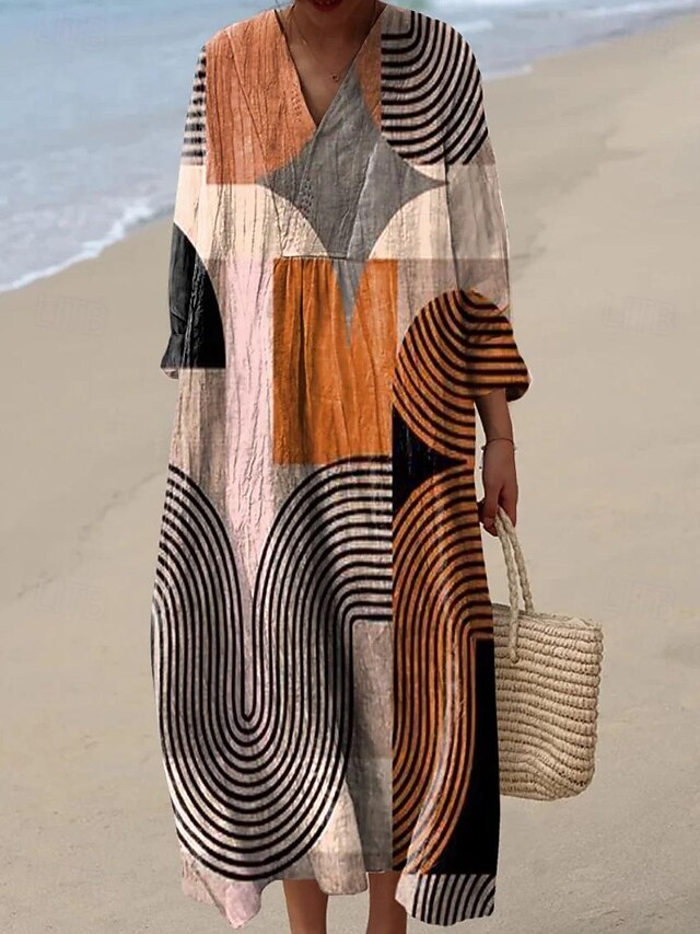 More information about Women's Midi Dress V Neck Long Sleeve Kaftan Lightweight Loose Fit A Line Dress Casual Boho Going out Graphic Geometric Long Sleeve V Neck Dark Yellow Red Light Brown Blue Fall