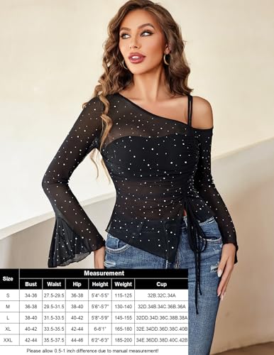 More information about Avidlove Women Mesh Top Long Sleeve Rhinestone Tops Off Shoulder Bell Sleeve Drawstring Blouse Sheer Sparkly Shirt S-XXL