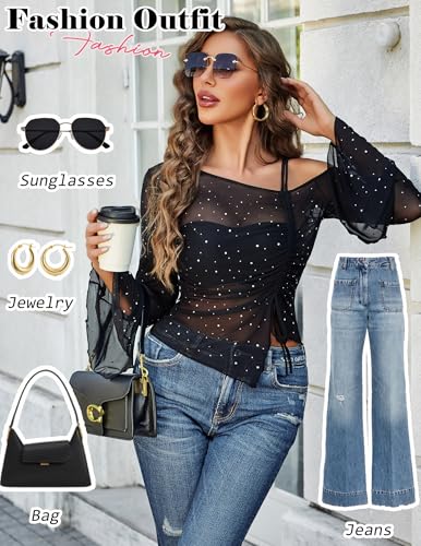 • Features: This sheer mesh top features elegant long sleeves, an off-shoulder design, and an adjustable drawstring.Adorned with delicate rhinestones, it creates a unique and eye-catching look