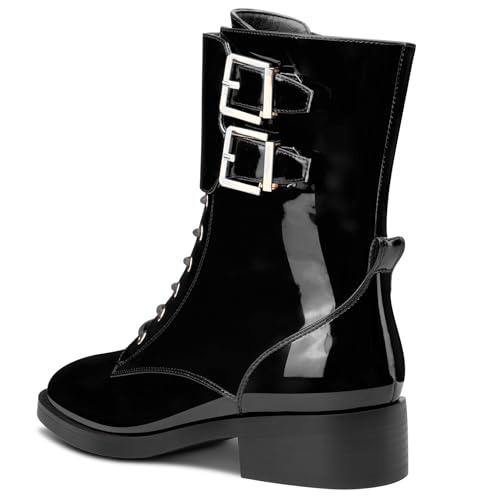 Castamere Womens Chunky Block Low Heel Square Toe Ankle Boots Short Bootie Lace-up Zipper Buckle Casual Dress Patent Leather Boots 4